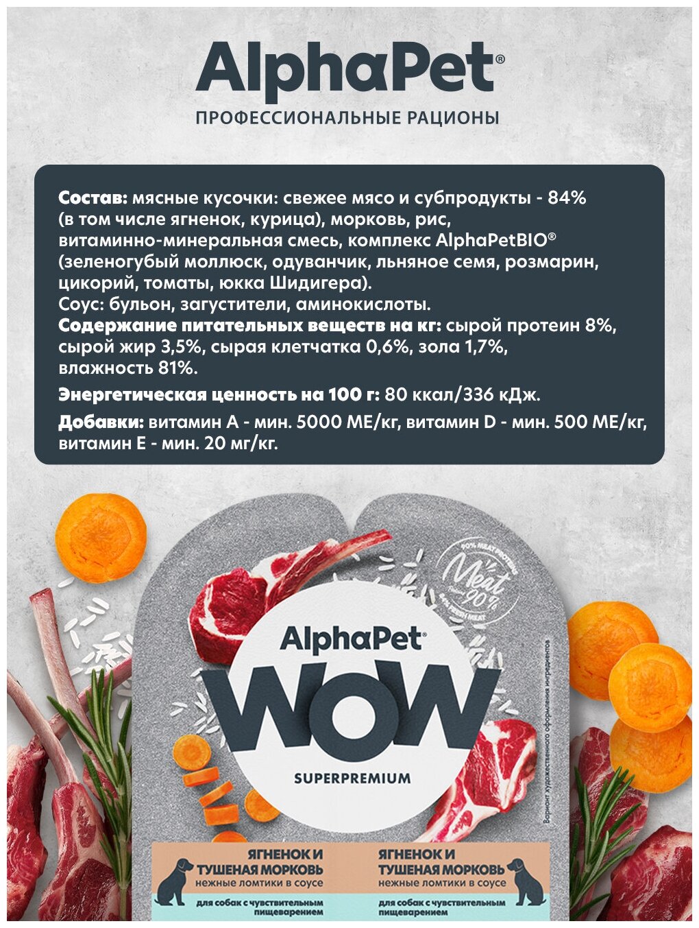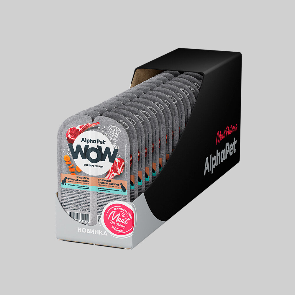 Купить Влажный полнорационный корм для собак с чувствительным пищеварением нежные ломтики ягненка и тушеная морковь в соусе AlphaPet WOW Superpremium 100г, 15 шт