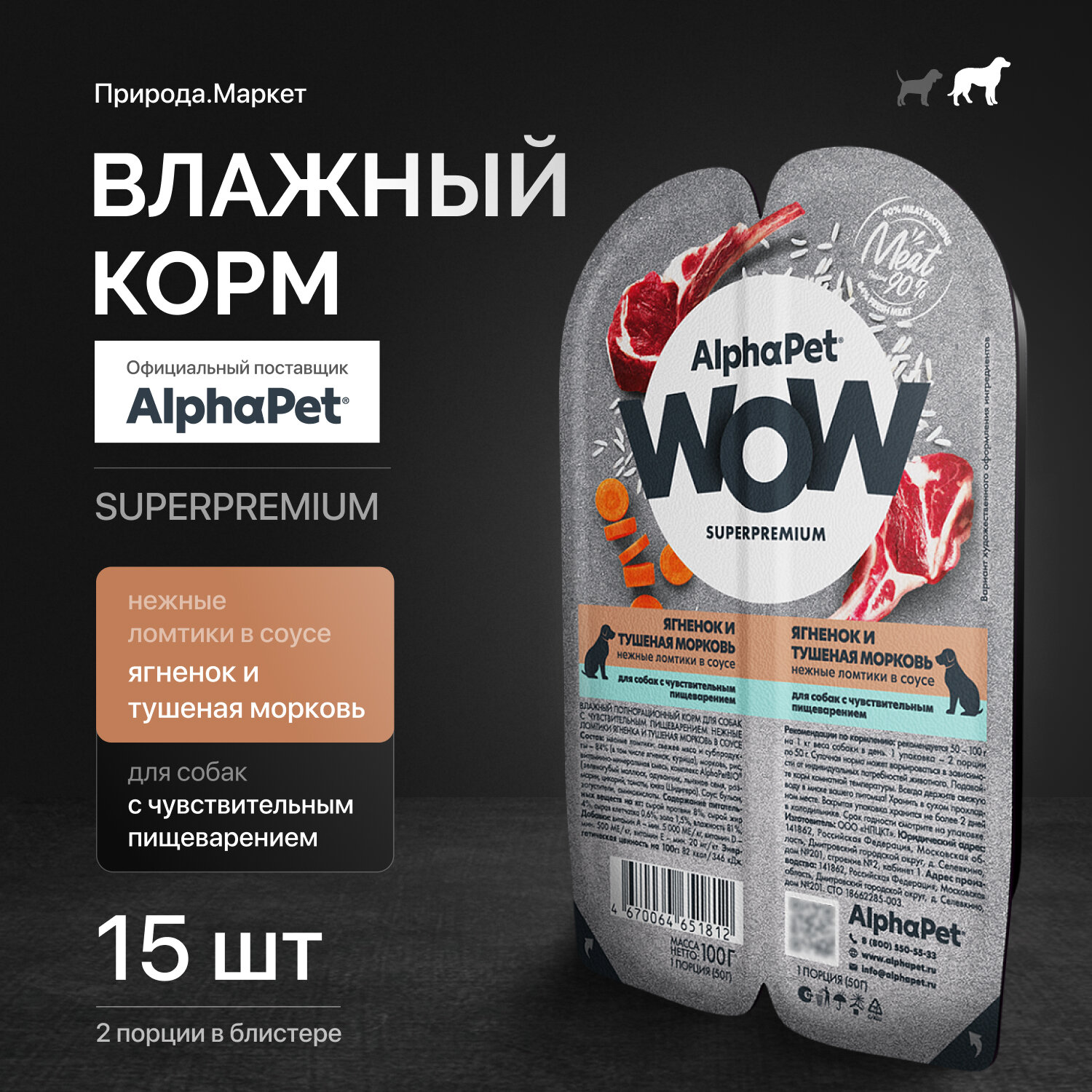 Влажный корм для собак AlphaPet WOW ягненок и тушеная морковь,упаковка 15 шт х 100 гр