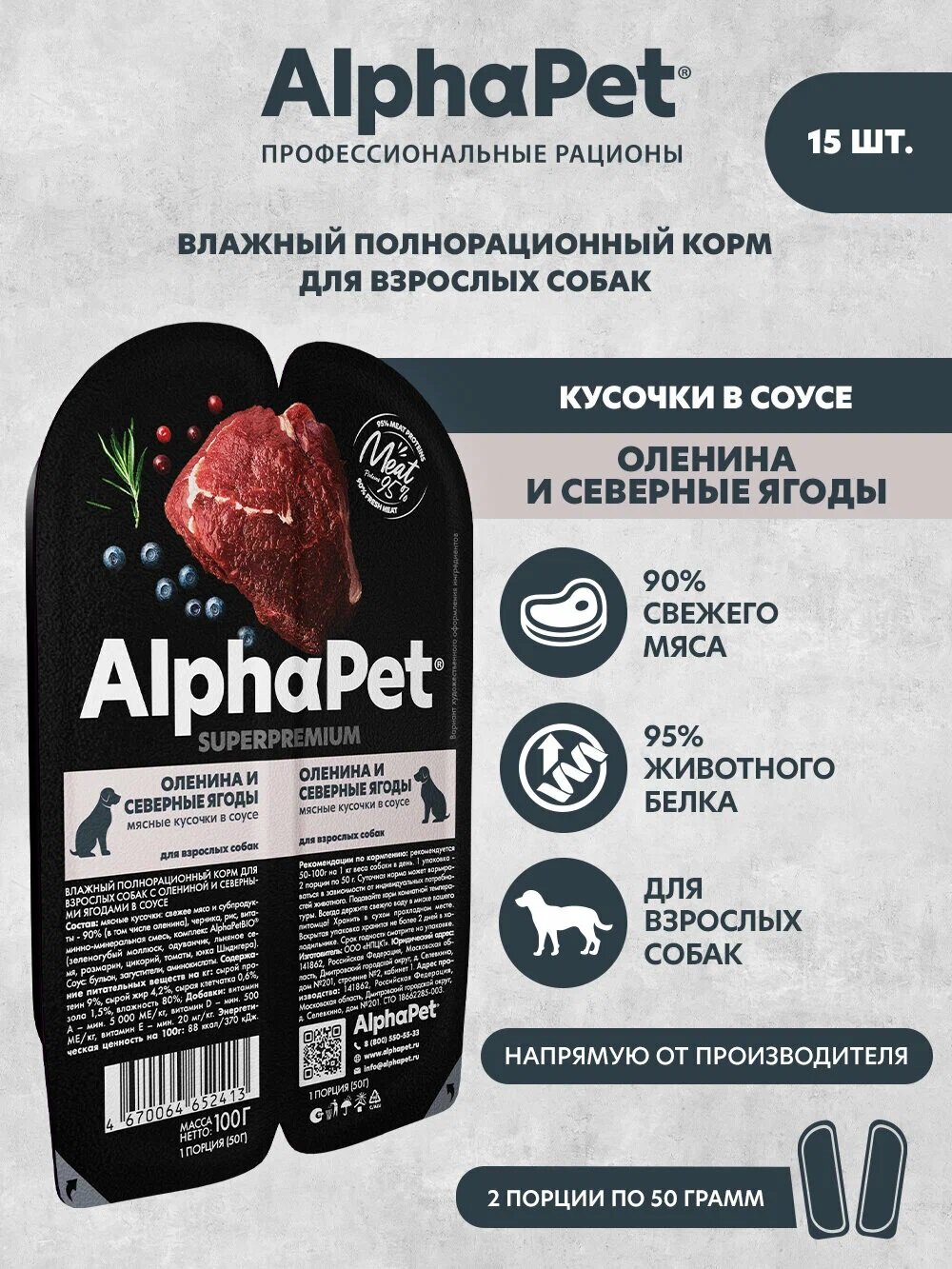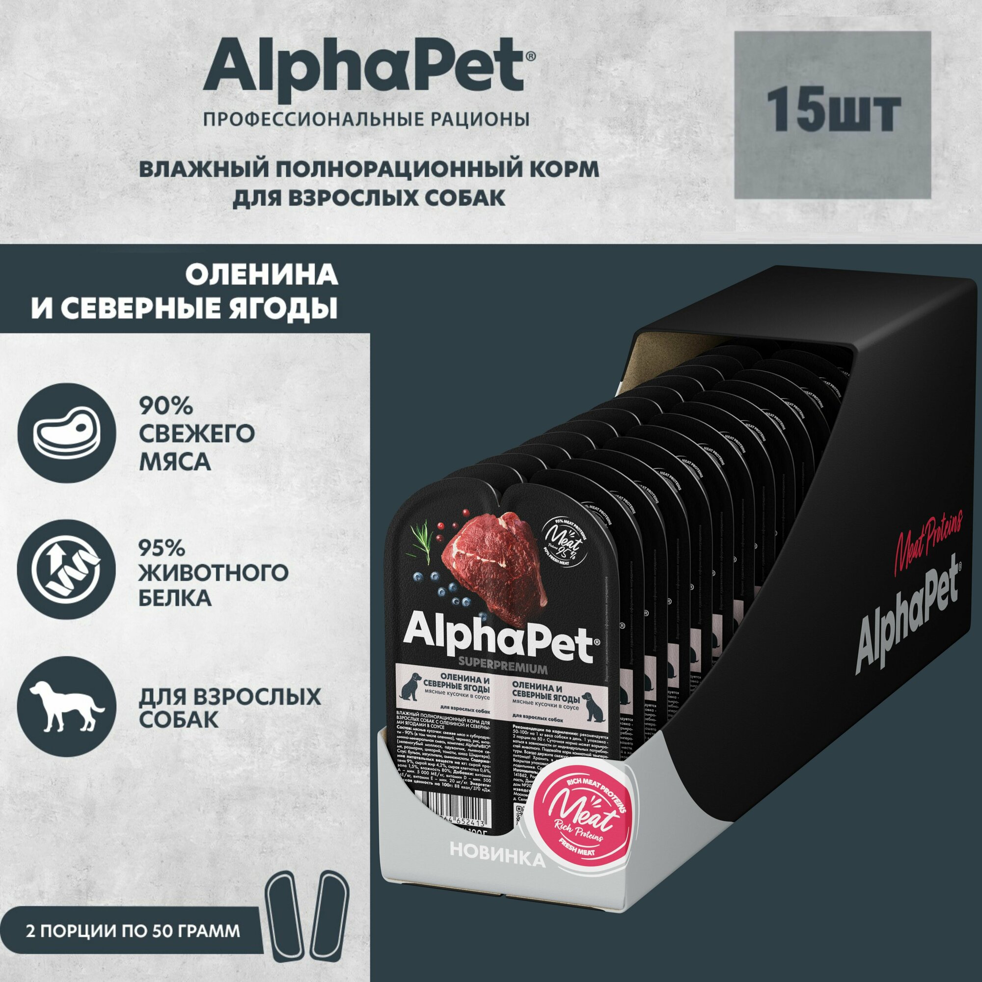 Влажный корм для собак AlphaPet Superpremium оленина и северные ягоды,упаковка 15 шт х 100 гр