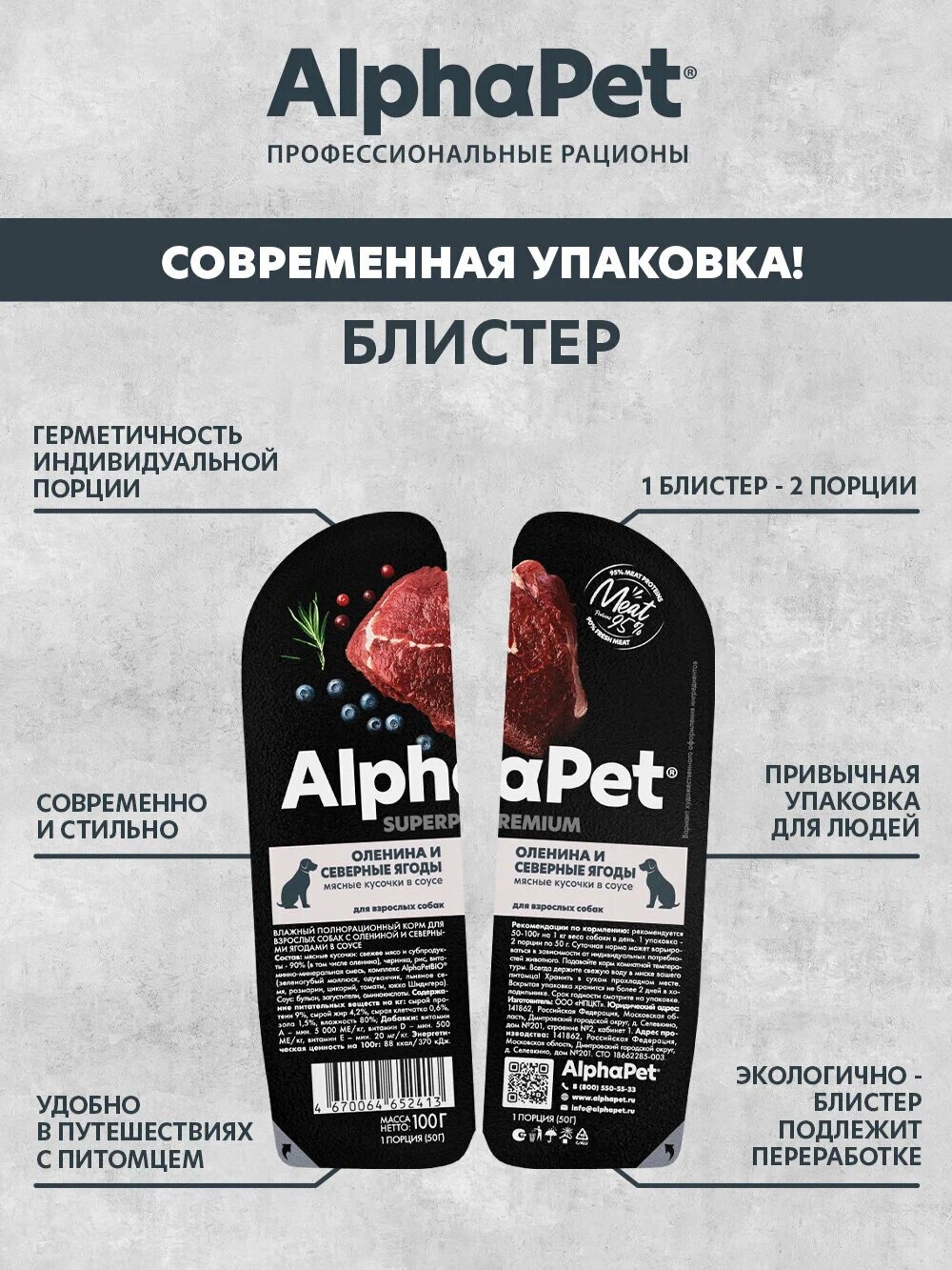 СохранитьВлажный полнорационный корм AlphaPet SuperPremium для взрослых собак, оленина и северные ягоды 100 гр. (15шт в уп) интересное: