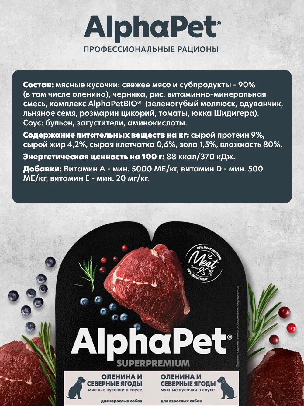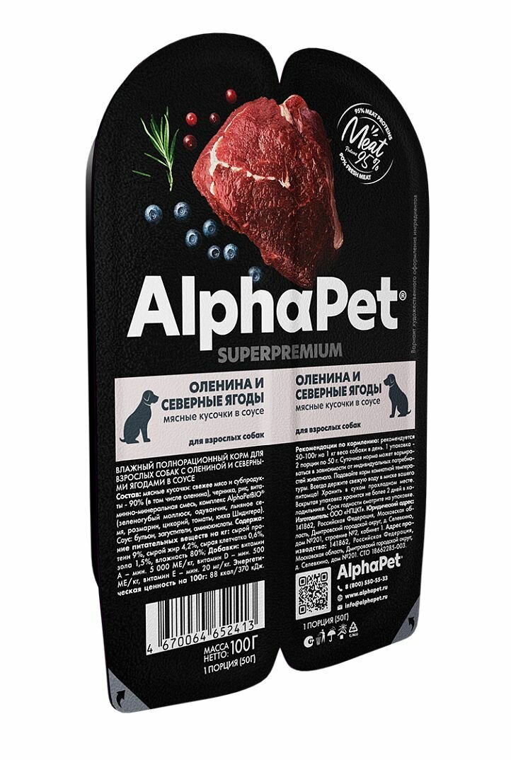 Купить Влажный полнорационный корм AlphaPet SuperPremium для взрослых собак, оленина и северные ягоды 100 гр. (15шт в уп)