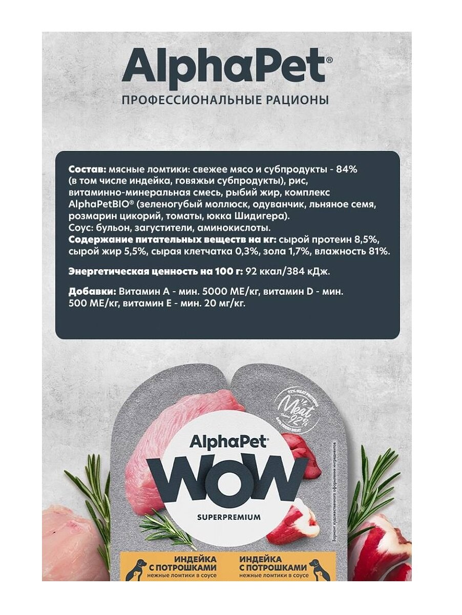 ALPHAPET WOW SUPERPREMIUM 100 гр ламистер влажный корм для щенков, беременных и кормящих собак индейка с потрошками 30 шт