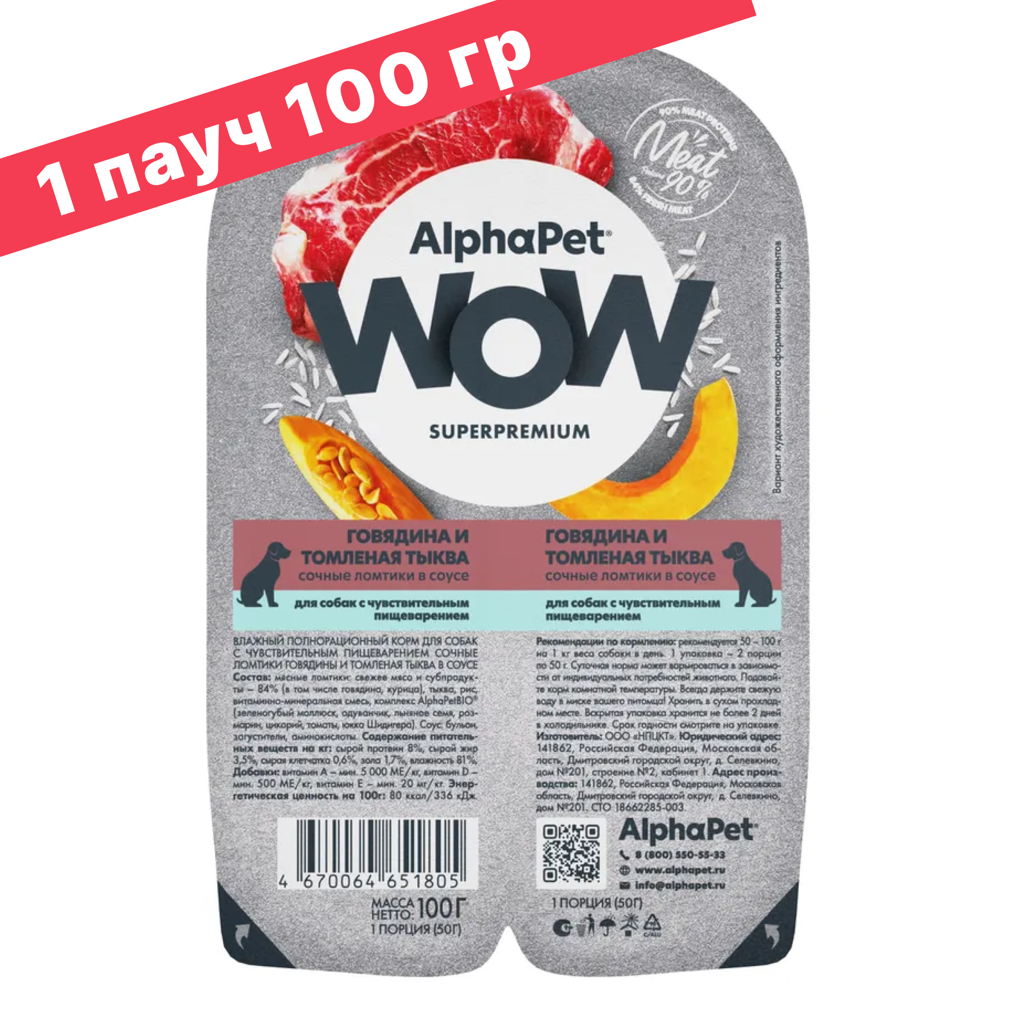 ALPHAPET WOW SUPERPREMIUM ламистер влажный корм для собак с чувствительным пищеварением говядина и томленая тыква 100г х 30шт