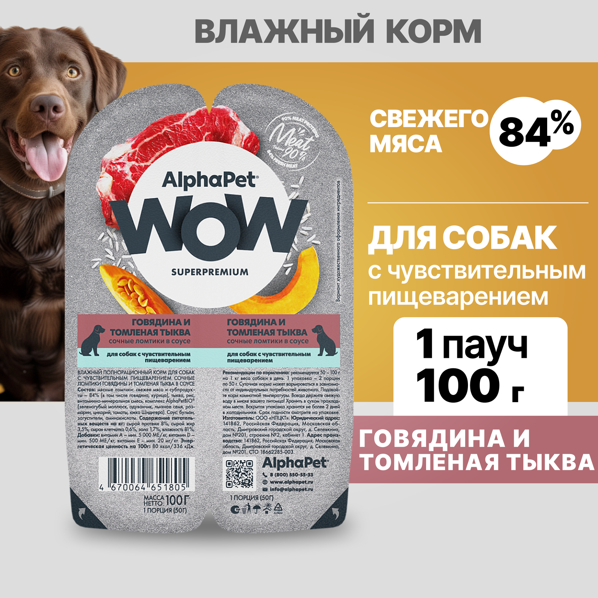 ALPHAPET WOW SUPERPREMIUM 100 гр ламистер влажный корм для собак с чув. пищ гов. и томленая тыква 1х15