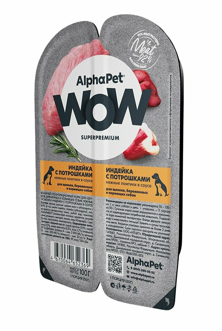 ALPHAPET WOW SUPERPREMIUM 100 гр ламистер влажный корм для щенков, беременных и кормящих собак индейка с потрошками 30 шт