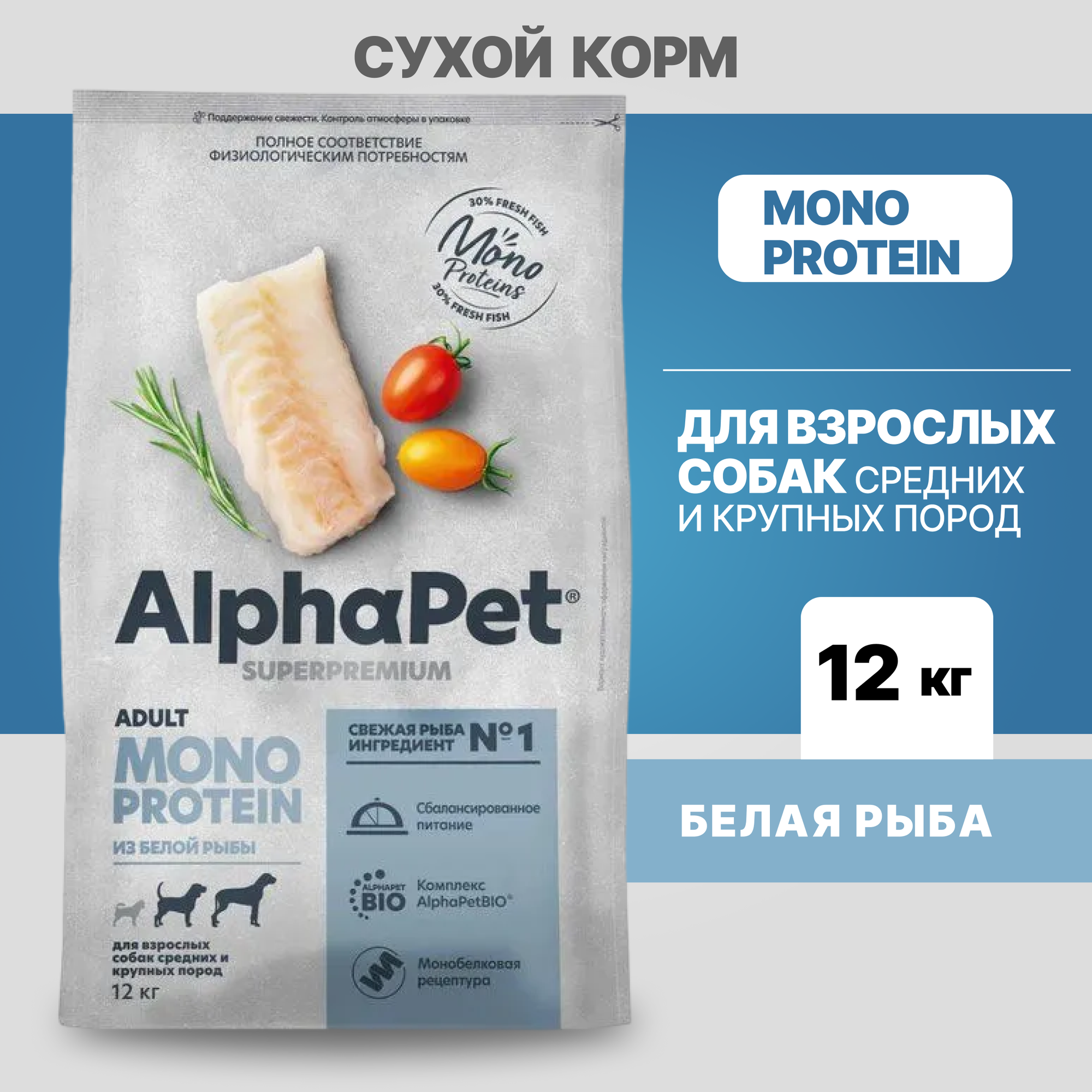 Cухой корм AlphaPet Superpremium Monoprotein (Альфапет) для взрослых собак средних и крупных пород, с белой рыбой, 12 кг