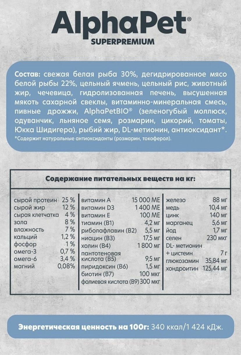 121357 AlphaPet Superpremium MONOPROTEIN Сухой корм для взрослых собак средних и крупных пород из белой рыбы 12 кг