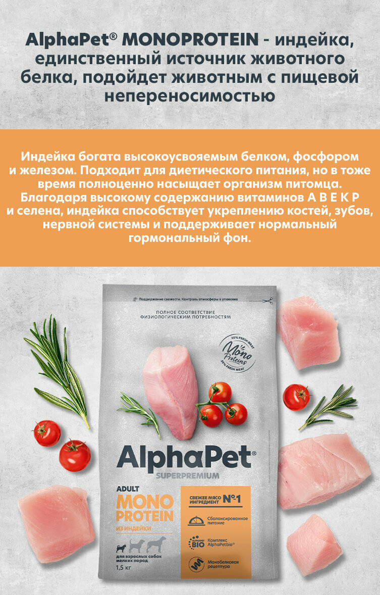 Сухой полнорационный корм MONOPROTEIN из индейки для взрослых собак мелких пород AlphaPet Superpremium 1,5 кг