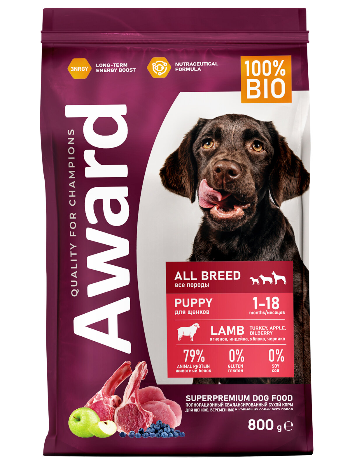 Купить Сухой корм AWARD для щенков от 1 месяца, беременных и кормящих сук всех пород, с ягненком и индейкой с добавлением яблока и черники, 800 г