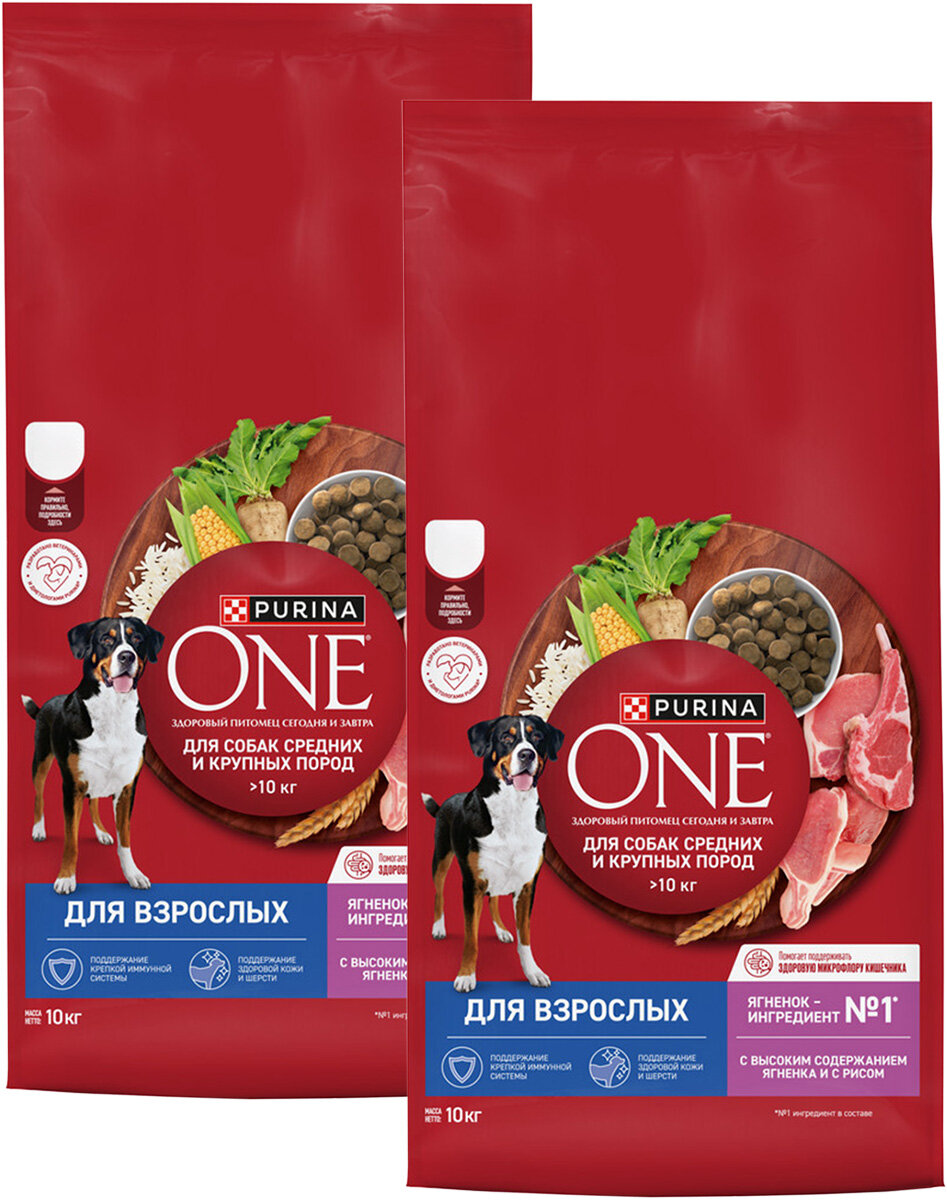 Купить PURINA ONE для взрослых собак средних и крупных пород с ягненком и рисом (10 + 10 кг)