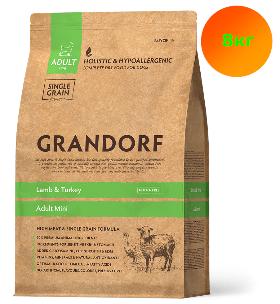 Grandorf Dog LambTurkey Mini сухой корм для взрослых собак мелких пород, с ягнёнком и индейкой 8 кг