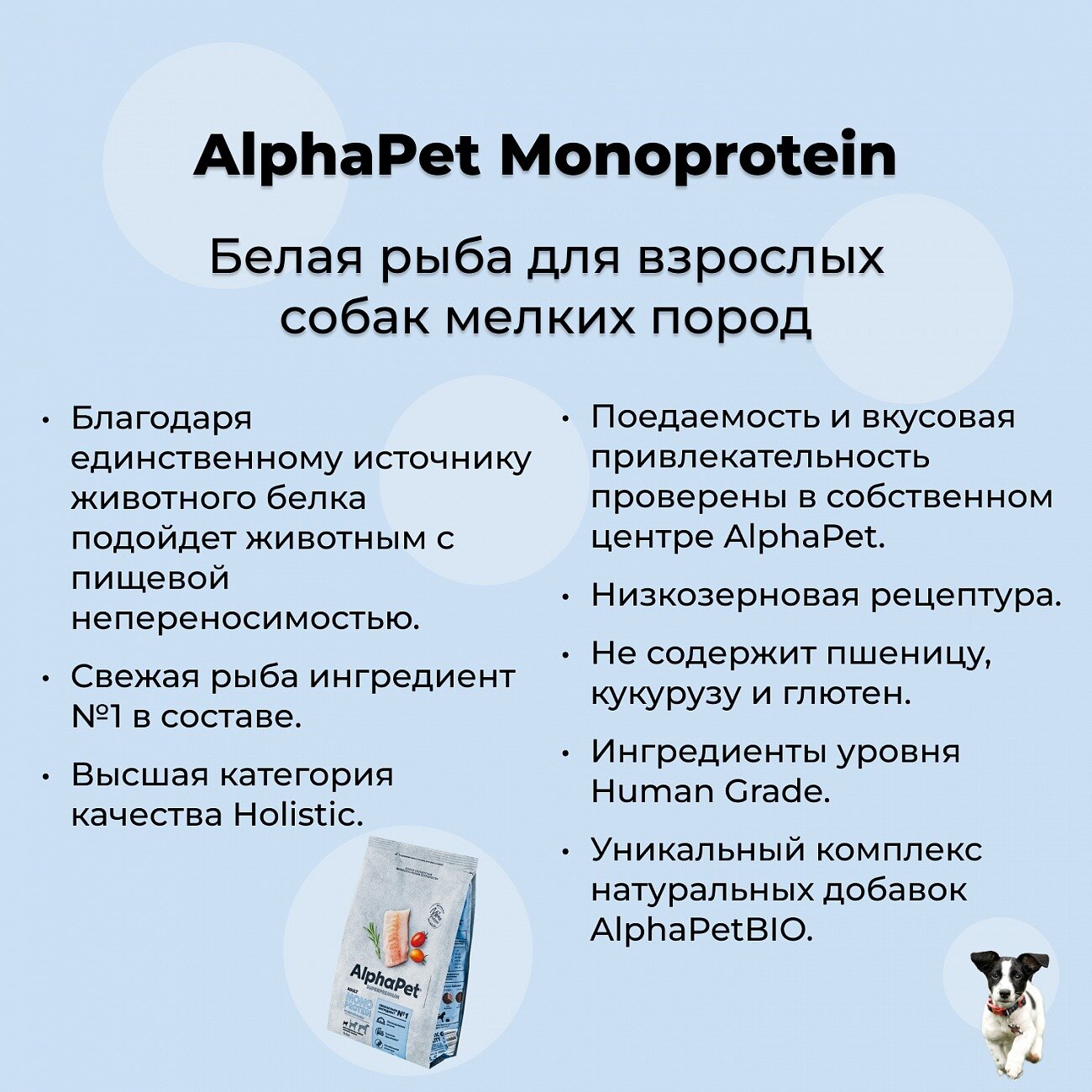 Сухой полнорационный корм MONOPROTEIN из белой рыбы для взрослых собак мелких пород AlphaPet Superpremium 0,5 кг