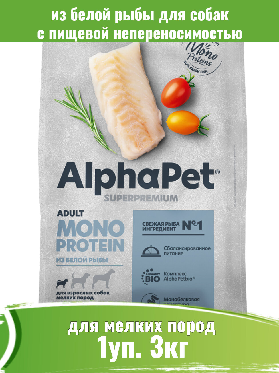 Сухой полнорационный корм ALPHAPET SUPERPREMIUM MONOPROTEIN из белой рыбы для взрослых собак мелких пород, 3 кг