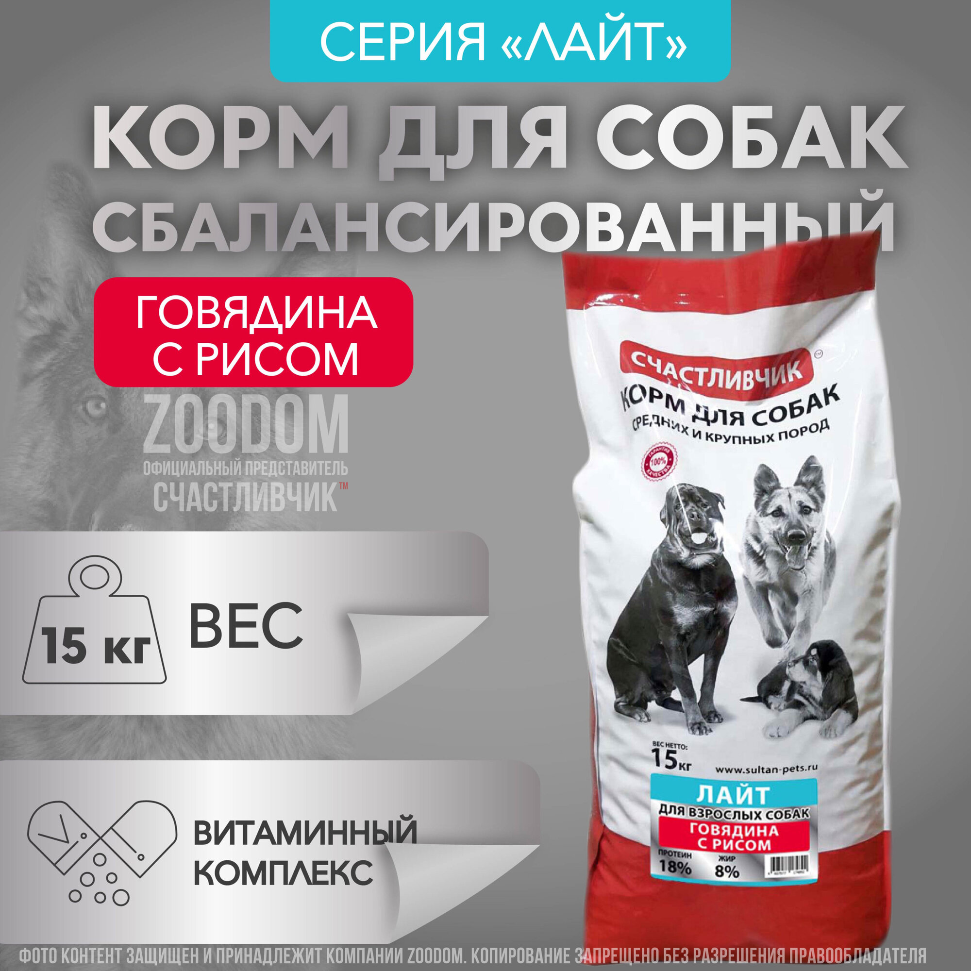 Ниже Вы можете прочитать отзывы на Счастливчик лайт 15 кг полнорационный корм для взрослых собак средних и крупных пород с говядиной и рисом, ознакомится с подробными характеристиками, посмотреть интересные обзоры и фотографии на Счастливчик лайт 15 кг полнорационный корм для взрослых собак средних и крупных пород с говядиной и рисом.