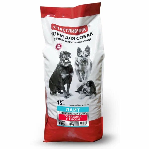 Купить Счастливчик лайт 15 кг полнорационный корм для взрослых собак средних и крупных пород с говядиной и рисом
