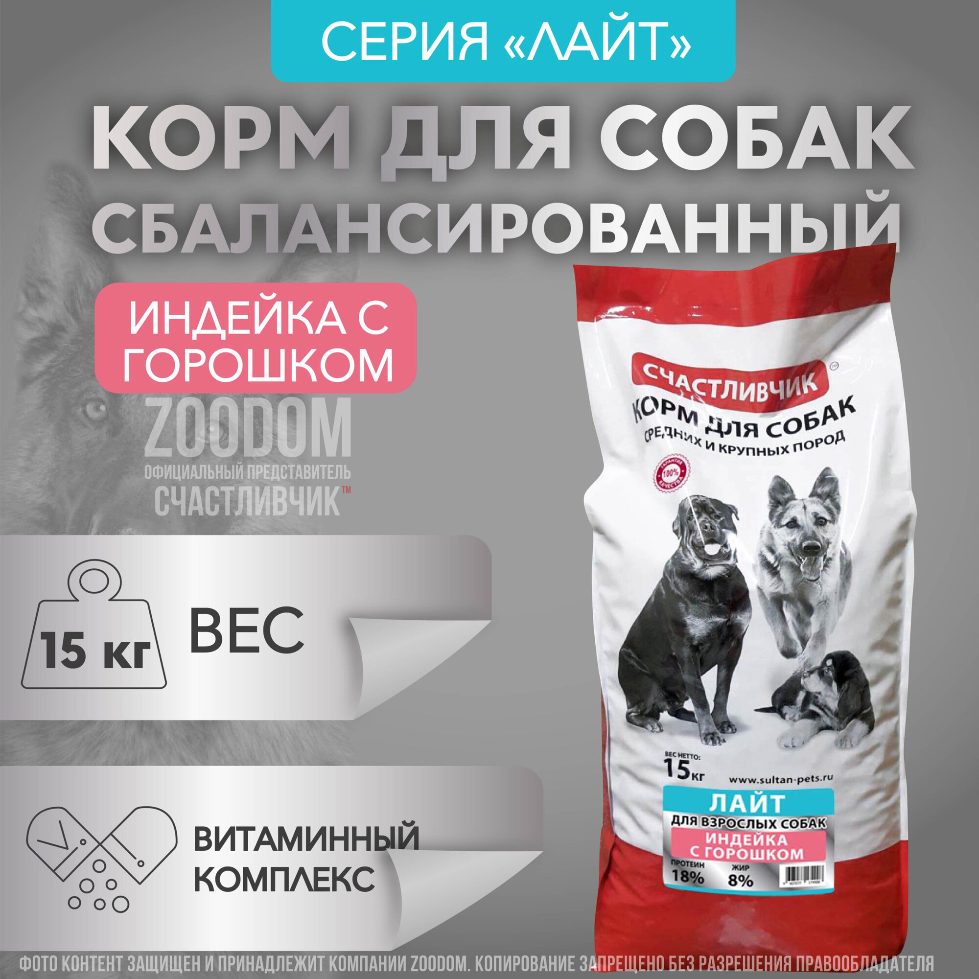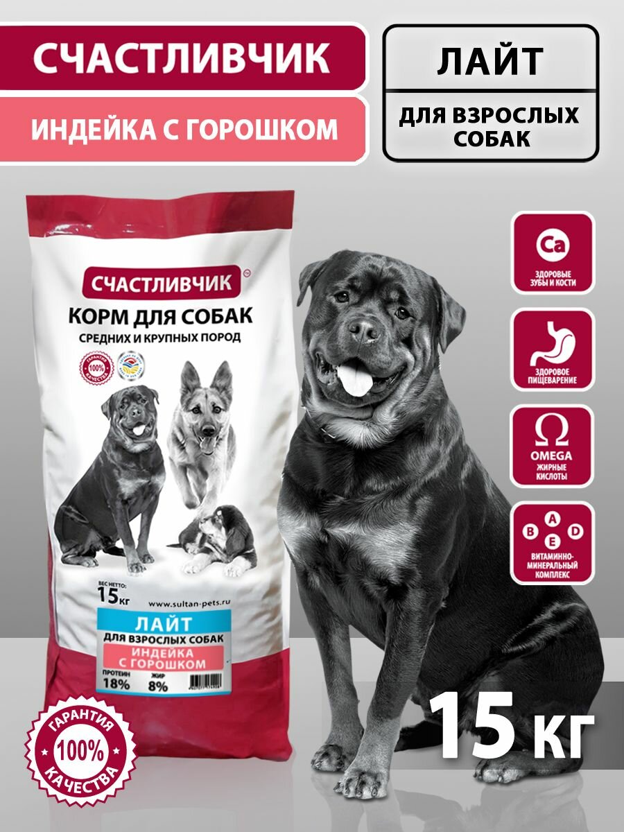Счастливчик лайт сухой корм для собак, индейка с горошком, 15 кг