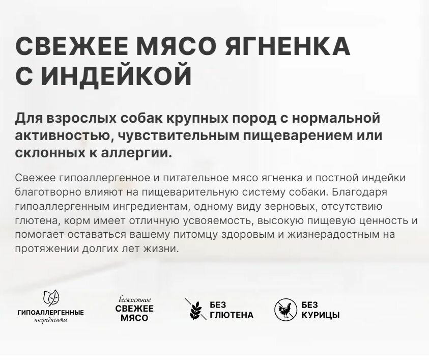 | Особые потребности | беззерновой / гипоаллергенный / для активных животных / для здоровья кожи и блеска шерсти / для здоровья костей и суставов / для снижения запаха стула / для ухода за ротовой полостью / при чувствительном пищеварении |