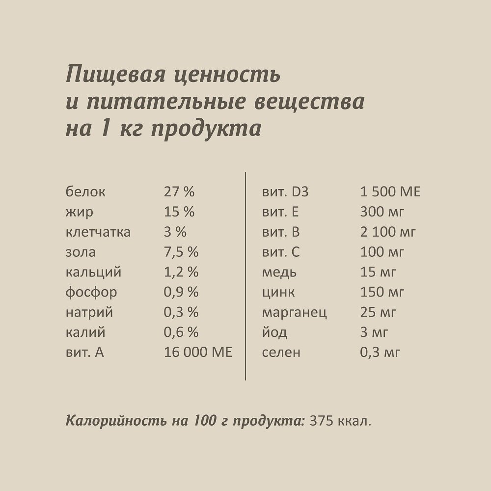 | Пищевая ценность | Сырой протеин: 28% Сырой жир:17% Сырая зола: 7% Сырая клетчатка: 3% Влажность: 9% Кальций 1,1% Фосфор 0,8% Омега-3: 0,28% Омега-6: 3% |