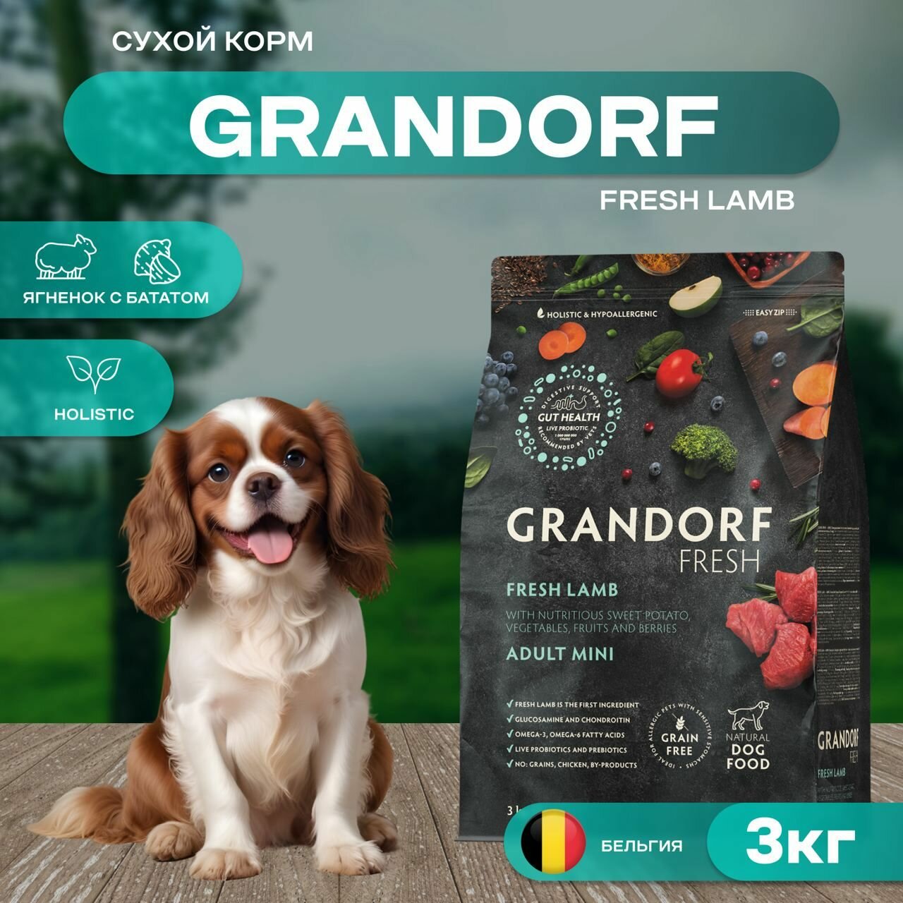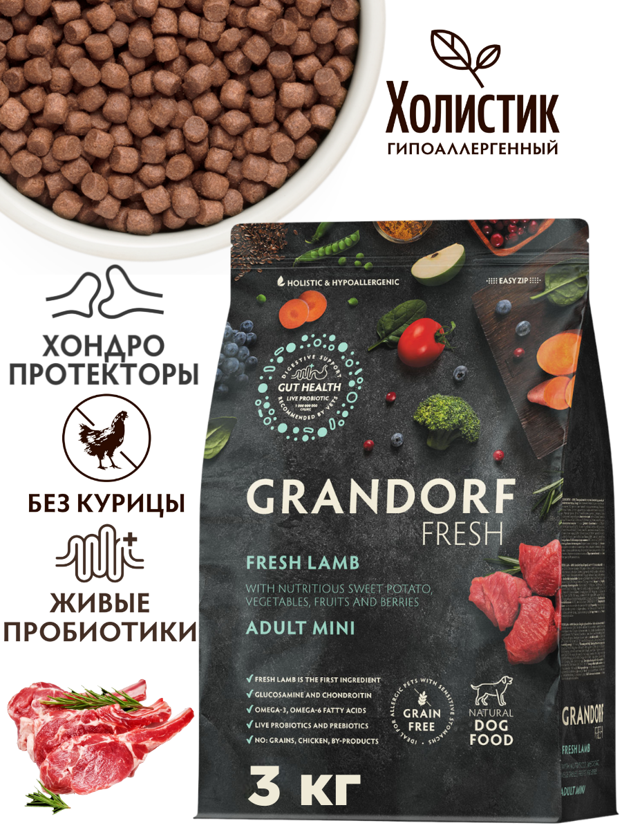 Сухой беззерновой корм Grandorf Fresh свежее мясо ягненка с бататом для взрослых собак средних и крупных пород, с живыми пробиотиками, с чувствительным пищеварением или склонных к аллергии, 3 кг