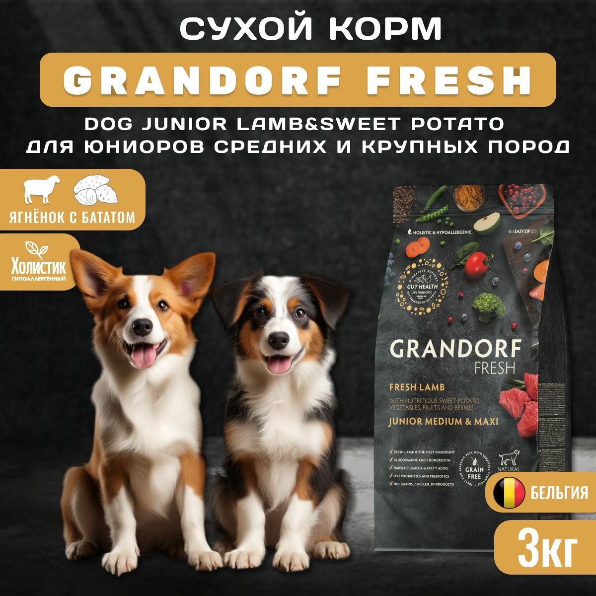GRANDORF FRESH GF JUNIOR MED&MAXI LAMB&SWEET POTATO безз д юниор сред и круп, с ягненком и бататом, 3 кг