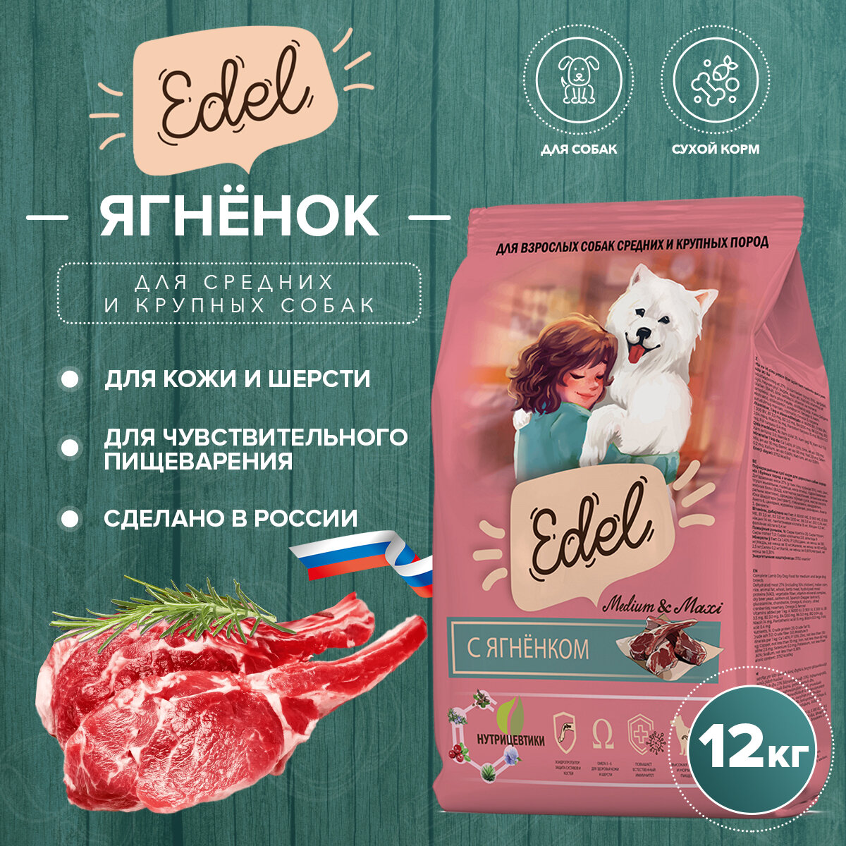 Корм сухой для собак средних и крупных пород Edel с ягненком при чувствительном пищеварении, 12 кг Эдель