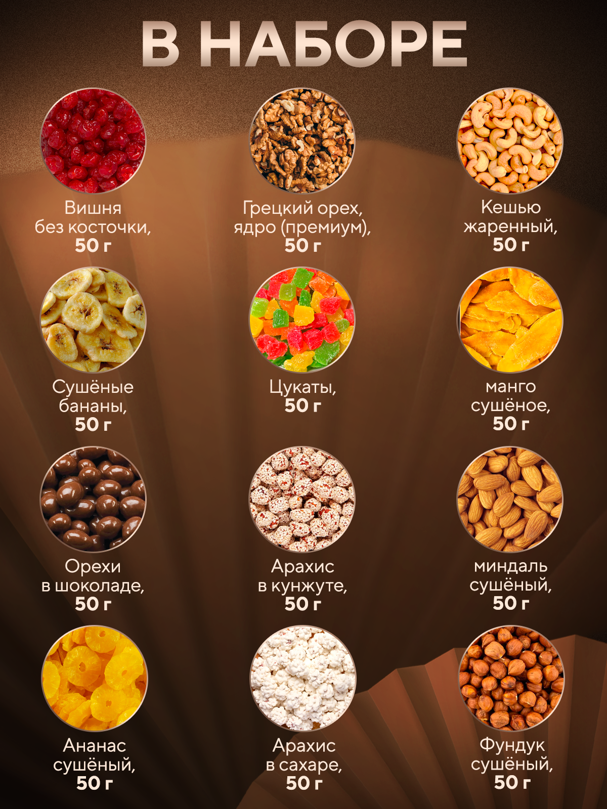 | Состав | грецкий орех ядро (премиум) - 50 гр., кешью жареный - 50 гр., сушеные бананы - 50 гр., орехи в шоколаде - 50 гр., арахис в кунжуте - 50 гр., миндаль - 50 гр., ананасы - 50 гр., Фундук - 50 гр., Арахис в сахаре - 50 гр., вишня без косточки - 50 гр., цукаты - 50 гр., манго-50 гр . |