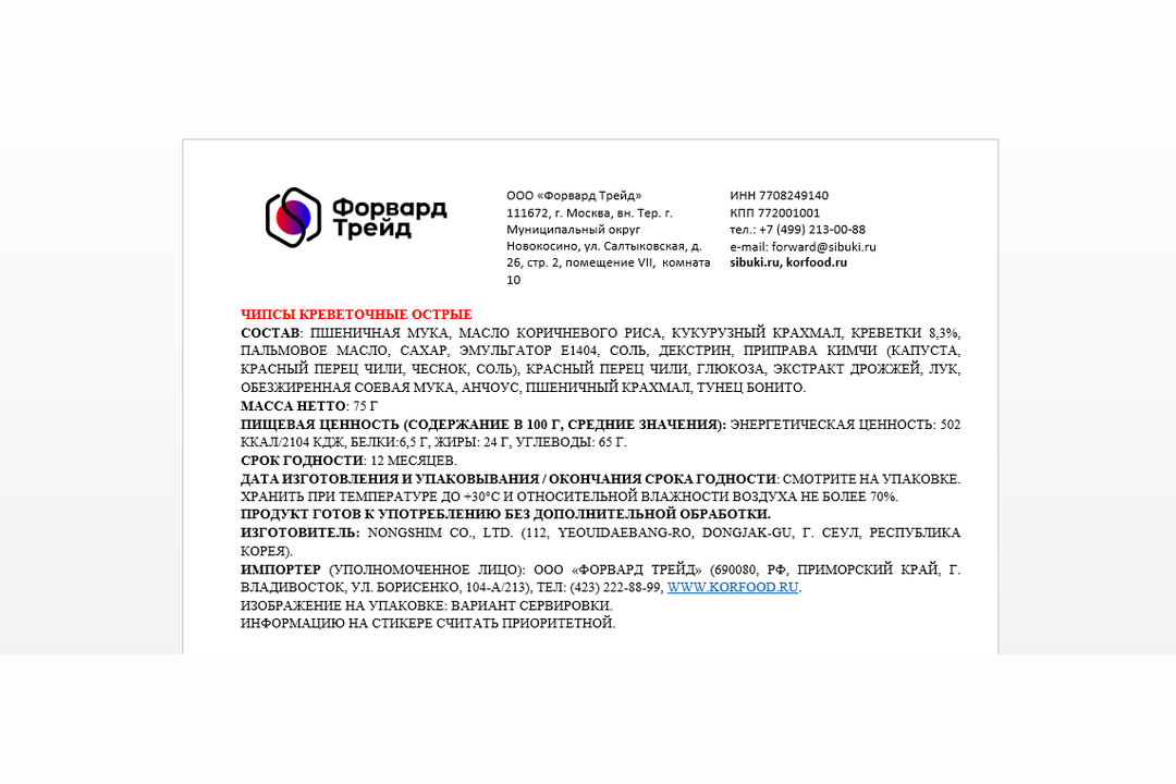 | Состав | пшеничная мука, масло коричневого риса, кукурузный крахмал, креветки 8, 3%, пальмовое масло, сахар, эмульгатор Е1404, соль, декстрин, приправа кимчи (капуста, красный перец чили, чеснок, соль) красны перец чили, глюкоза, экстракт дрожжей, лук, обжареная соевая мука, анчоус, пшеничный крахмал, тунец бонито |
