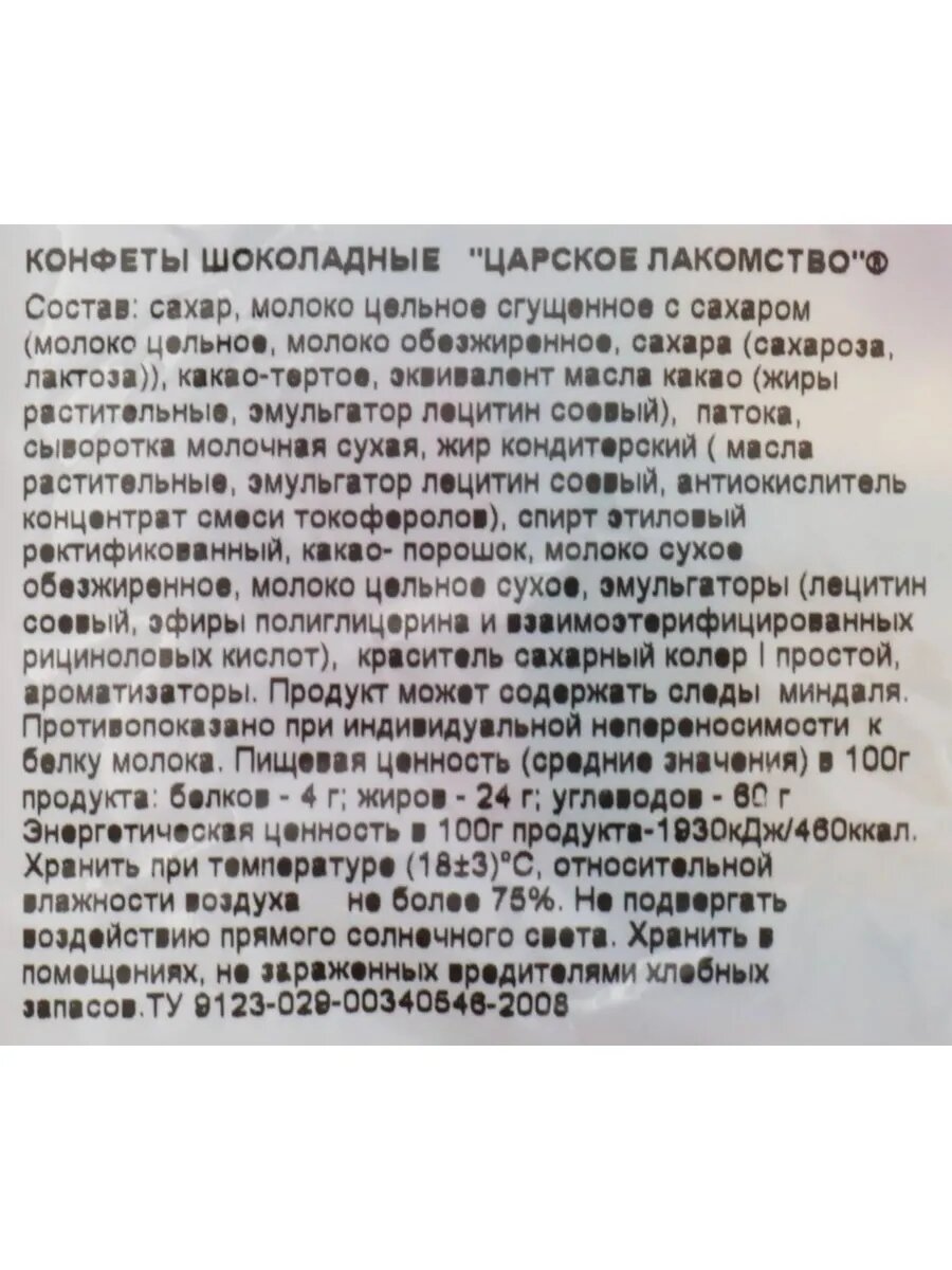 | Состав | сахар, молоко цельное сгущенное с сахаром (цельное молоко, обезжиренное молоко, сахар (сахароза, лактоза)), какао тертое, эквивалент масла какао (масла растительные, эмульгатор-лецитин соевый (Е322)), сыворотка сухая молочная, жир кондитерский (масло растительное, антиокислители - Е 300, Е 307), патока, молоко сухое обезжиренное, спирт этиловый ректификованный, эмульгаторы - лецитин соевый (Е322), (Е476); какао-порошок, молоко сухое цельное, фундук, краситель сахарный колер, ароматизаторы; продукт может содержать следы: миндаля, арахиса,яичных продуктов, глютена |