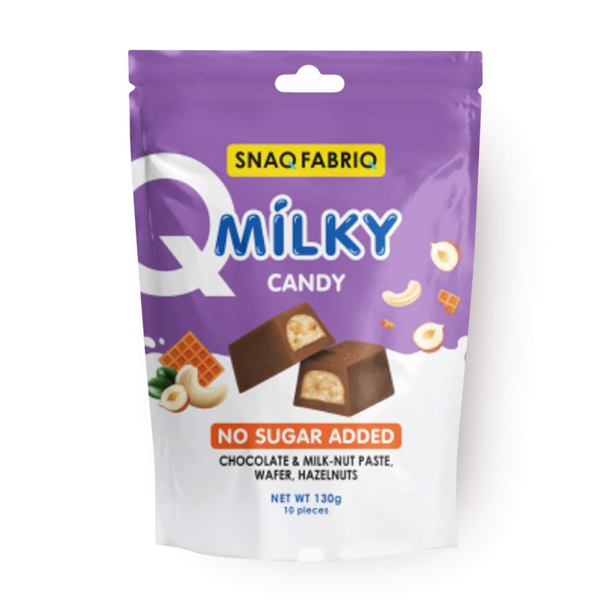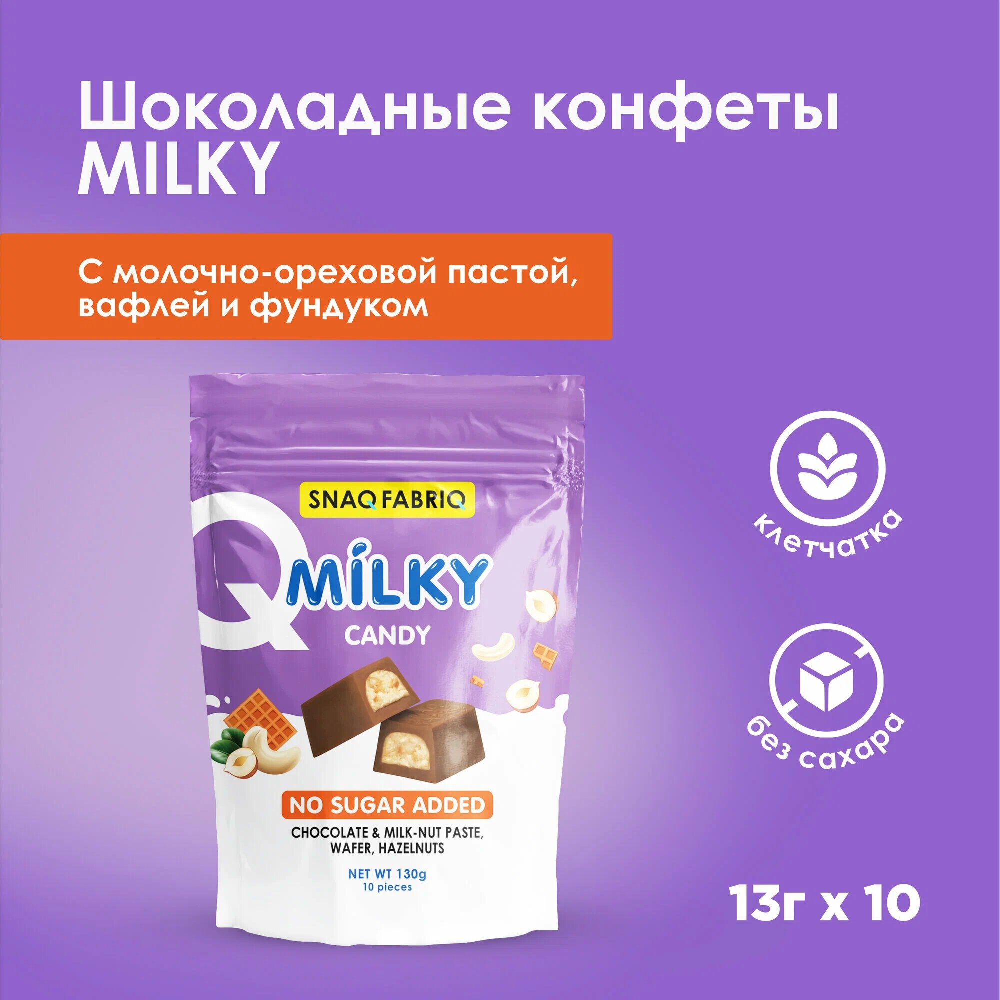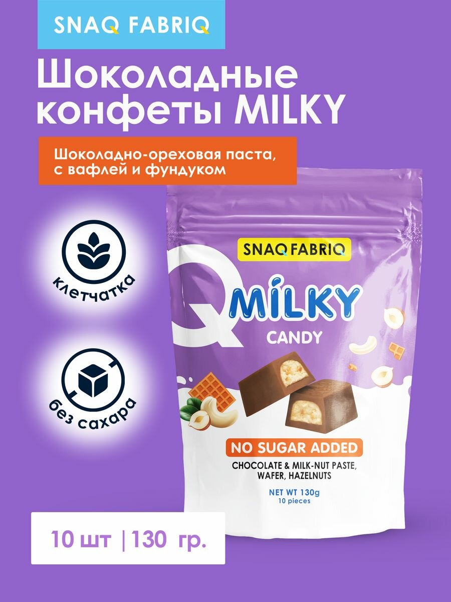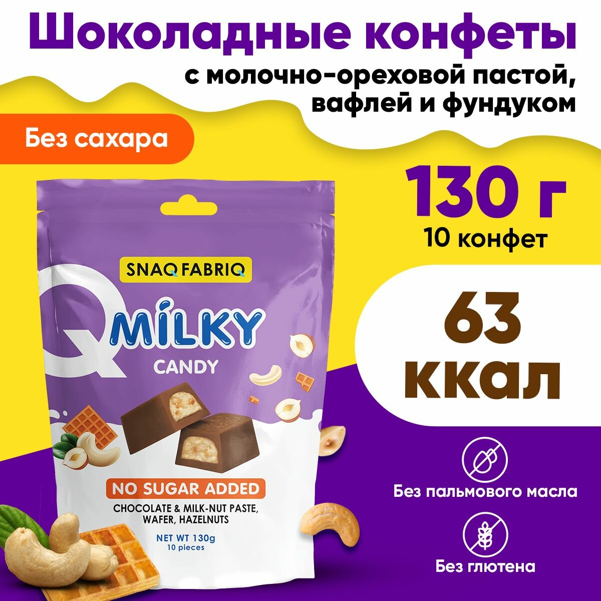 Купить SNAQ FABRIQ Шоколадные конфеты без сахара MILKY CANDY с молочно-ореховой пастой, вафлей и фундуком, 130г (10шт х 13г)