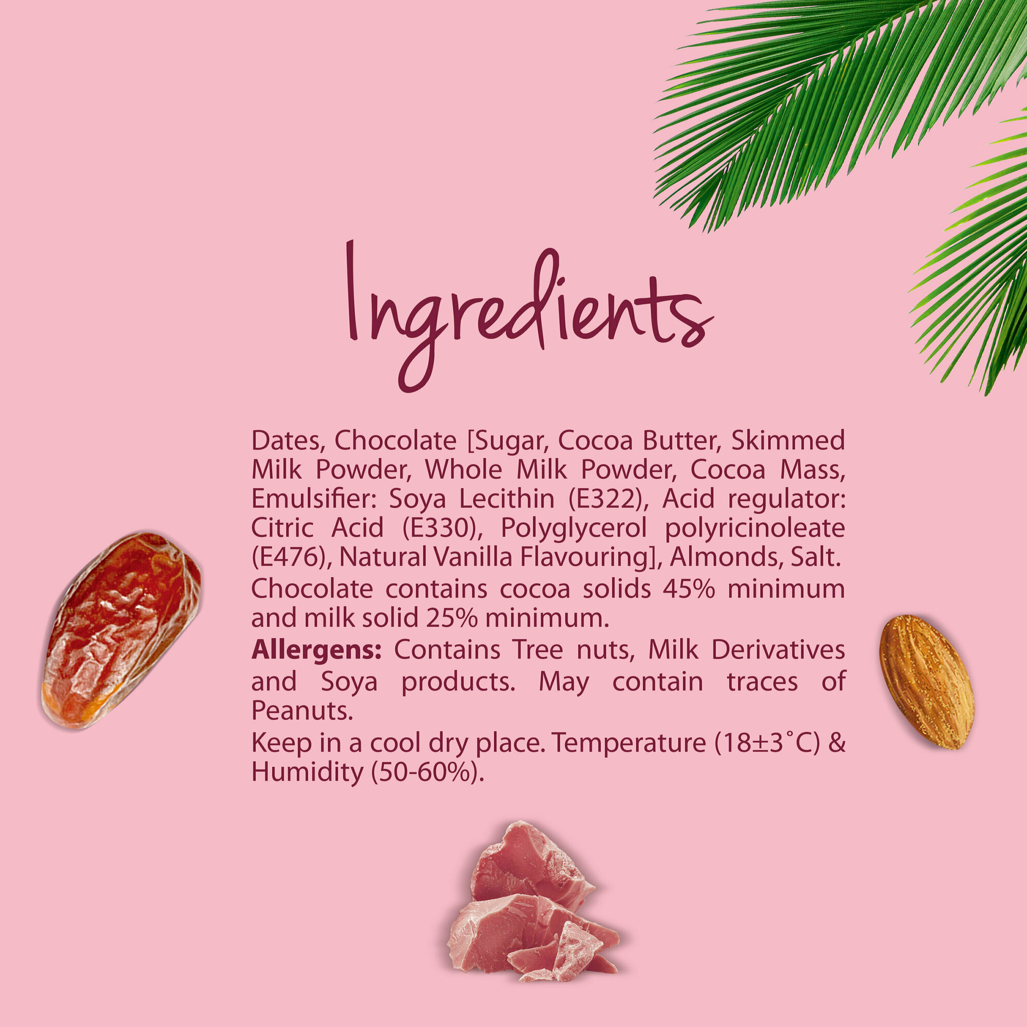 | Состав | финики сушеные, белый шоколад (сахар, какао масло, цельное сухое молоко, обезжиренное сухое молоко, молочный жир, эмульгатор: лецитин (соевый), Е476; натуральный ароматизатор - ваниль), карамель (цельное сухое молоко, обезжиренное сухое молоко, молочный жир, глюкоза, гидрогенизированное растительное масло, сахар, регулятор кислотности: гидрокарбонат натрия, лимонная кислота; соль, эмульгатор: лецитин (соевый), натуральный ароматизатор - ваниль), молочный шоколад (сахар, какао масло, цельное сухое молоко, какао тертое, обезжиренное сухое молоко, какао порошок, молочный жир, эмульгатор: лецитин (соевый), натуральный ароматизатор - ваниль, эмульгатор: Е476), миндаль, соль. Может содержать следы арахиса. |
