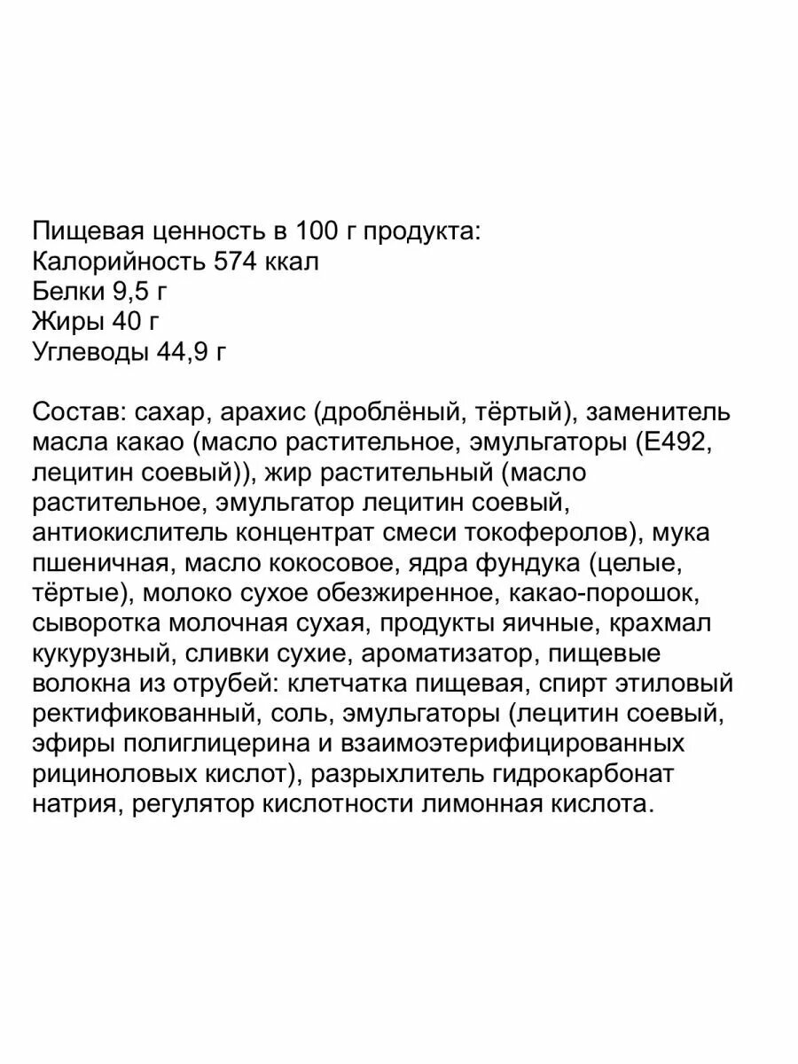 | Состав | сахар, арахис дробленый, заменитель масла какао (масло растительное, эмульгаторы: Е492, лецитин соевый), жир растительный (масло растительное, антиокислители: аскорбиновая кислота, Е307), мука пшеничная, масло кокосовое, сыворотка молочная сухая, арахис тертый, ядра фундука, какао порошок, крахмал кукурузный, молоко сухое обезжиренное, ядра фундука тертые, спирт этиловый ректификованный, желток яичный сухой, эмульгаторы (лецитин соевый, Е476), ароматизатор натуральный "Сливки с экстрактом сливок" (мальтодекстрин, сливки сухие), соль, белок яичный сухой, волокна пшеничные пищевые, разрыхлитель гидрокарбонат натрия, регулятор кислотности кислота лимонная |