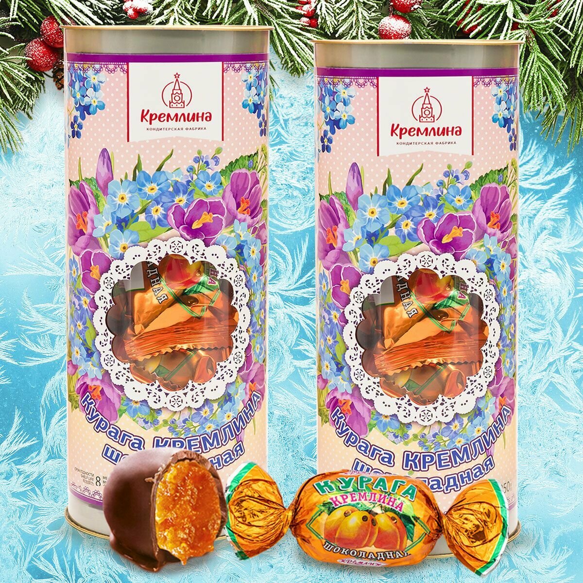 Подарок на Новый Год, набор конфет подарочных Курага Шоколадная в тубах "Матрешка Гжель" , спайка 2 тубы по 250 грамм
