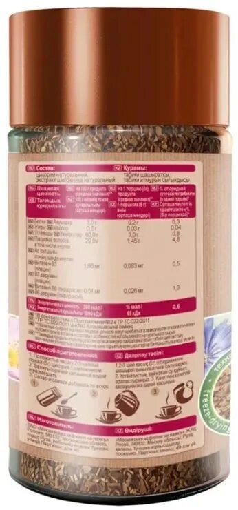 | Способ приготовления | положить в чашку 2-3 чайные ложки(5г) цикория; залить горячей кипяченой водой и размешать; сахар и сливки добавить по вкусу |