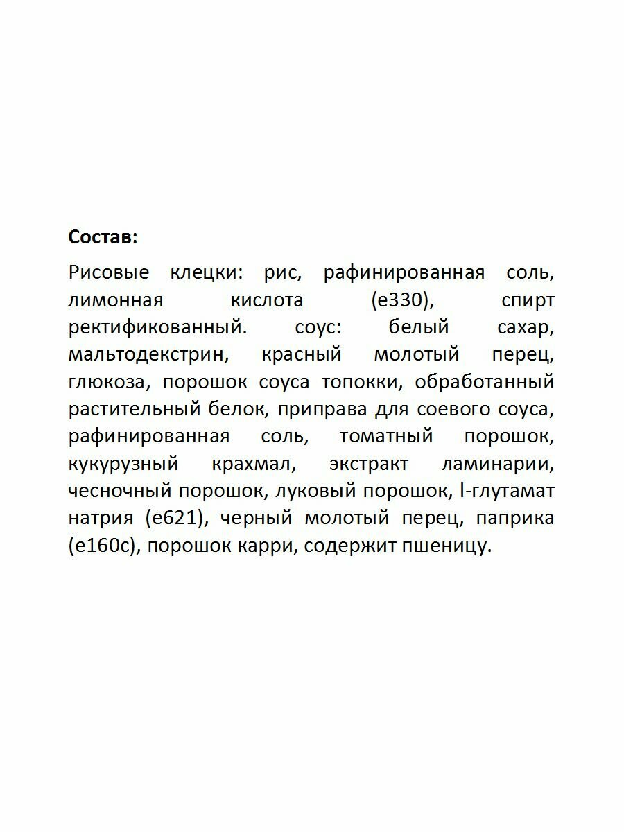 | Состав | рисовые клецки ток: рисовая мука, соль, лимонная кислота(регулятор кислотности); соус: порошок молочной сыворотки, сахар, кукурузный крахмал,соевое молоко, сливочное масло, декстрин, порошок сухих сливок, усилитель вкуса и аромата ( л-глютамин натрия), перцовый порошок, лук, морковь, соль, сыр пармезан, ксантановая камедь, петрушка, паприка |