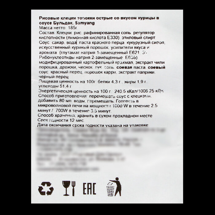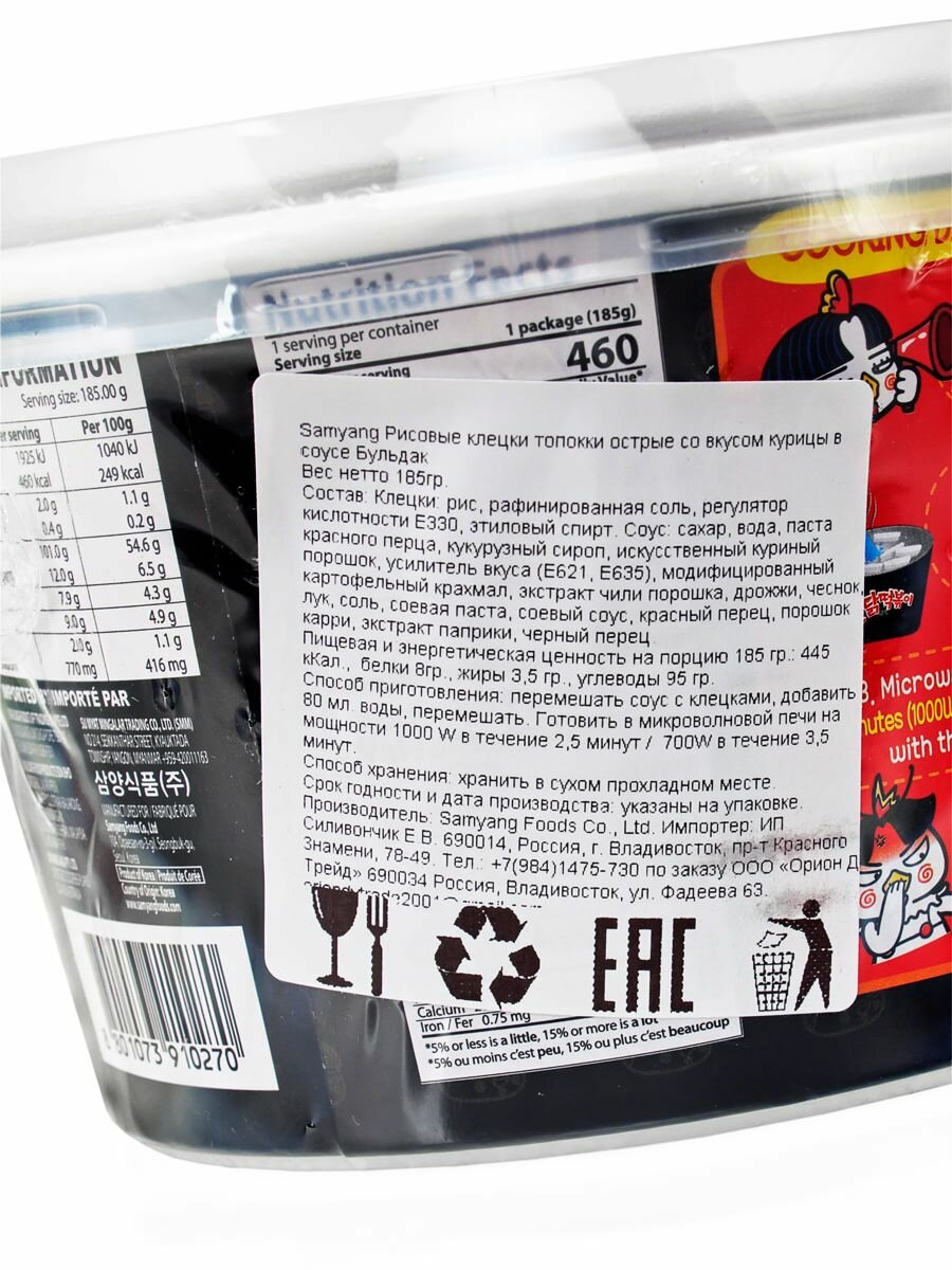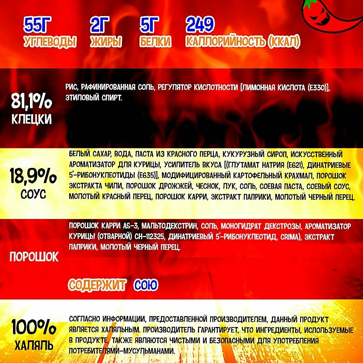 | Состав | Рисовые клёцки (81,1%) - рис (99,1%), соль (0,5%), лимонная кислота E330 (0,3%), этиловый спирт (0,1%) / Соус (8,9%) - сахар, вода, перцовая паста, кукурузный сироп, искусственный аромат курицы, усилитель вкуса (E621, E635), модифицированный картофельный крахмал, порошок экстракта чили, дрожжевой порошок, чеснок, лук, соль, соевая паста, соевый соус, красный перец молотый, порошок карри, экстракт паприки, чёрный перец молотый. |