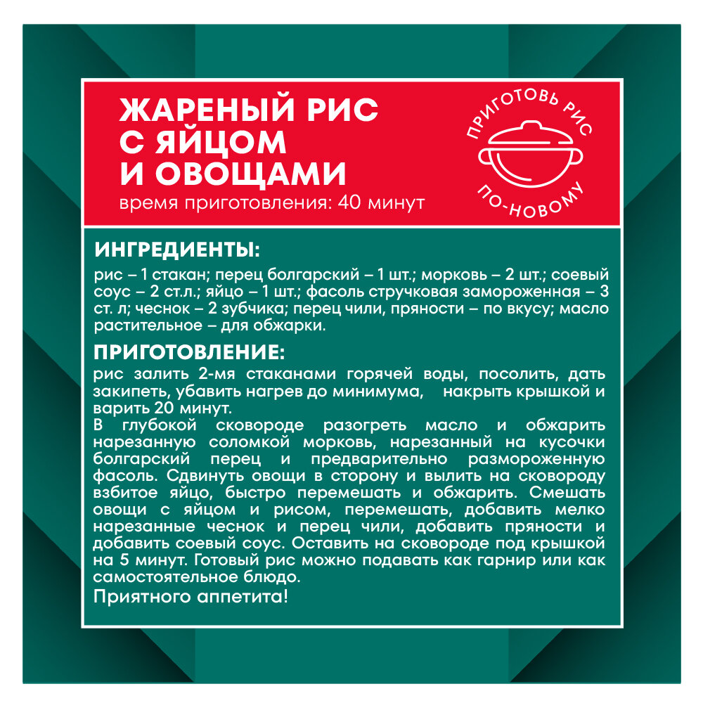 | Состав | Крупа рисовая шлифованная (рис длиннозёрный), первый сорт. Возможно наличие следов глютена |