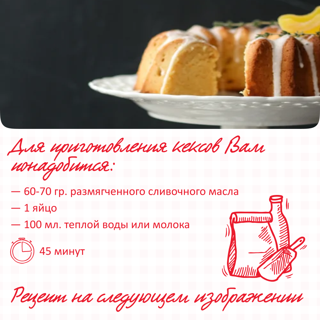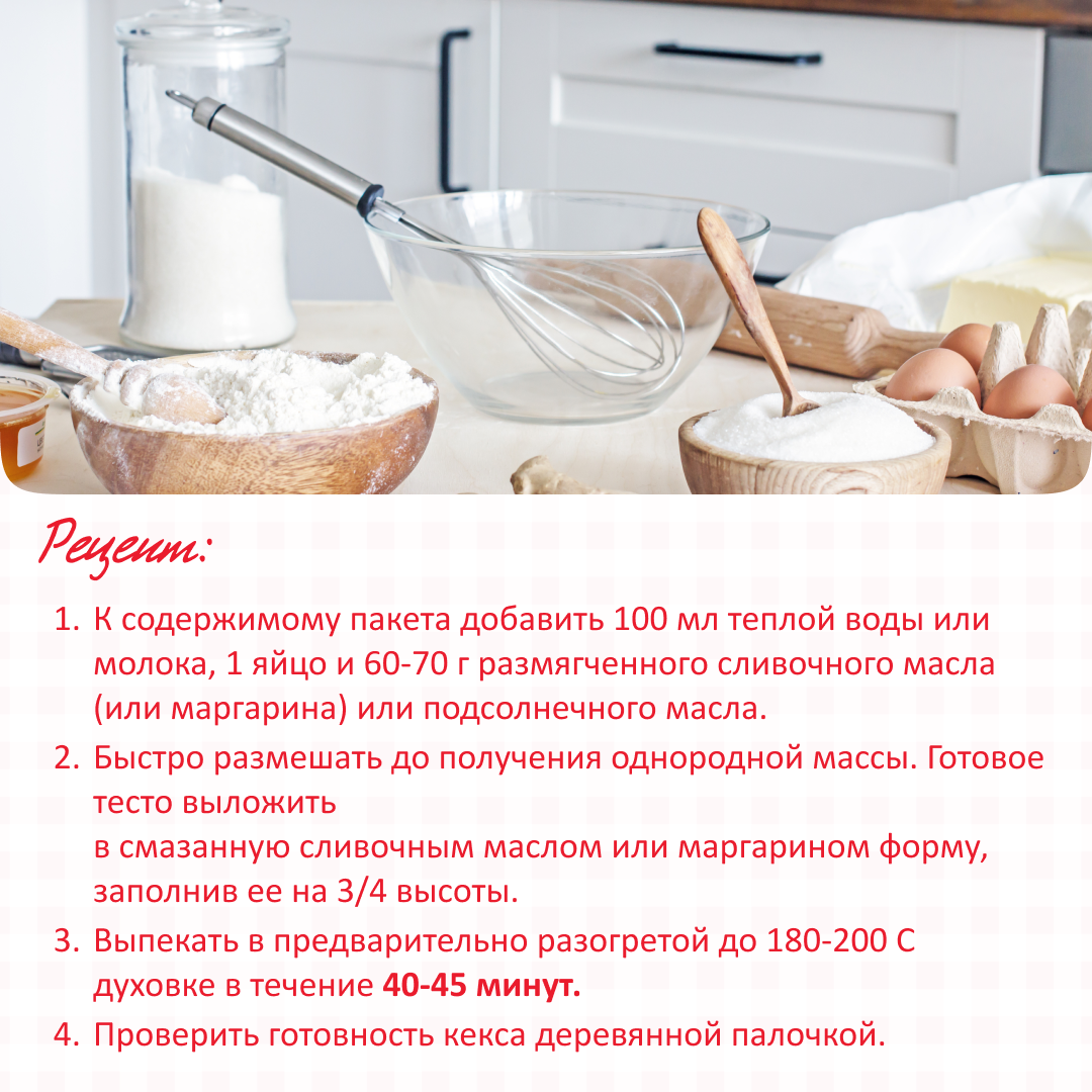| Дополнительная информация | НЕОБХОДИМЫЕ ИНГРЕДИЕНТЫ: 60-70 г размягченного сливочного масла или маргарина, 1 яйцо, 100 мл теплой воды или молока. СПОСОБ ПРИГОТОВЛЕНИЯ: смешайте все ингредиенты до однородной массы. Выложите готовое тесто в смазанную маслом форму для кекса, заполнив ее на 3/4 высоты. Выпекайте в предварительно разогретой до 180-200 С духовке до готовности (35-45 минут). Проверьте готовность кекса деревянной палочкой. |