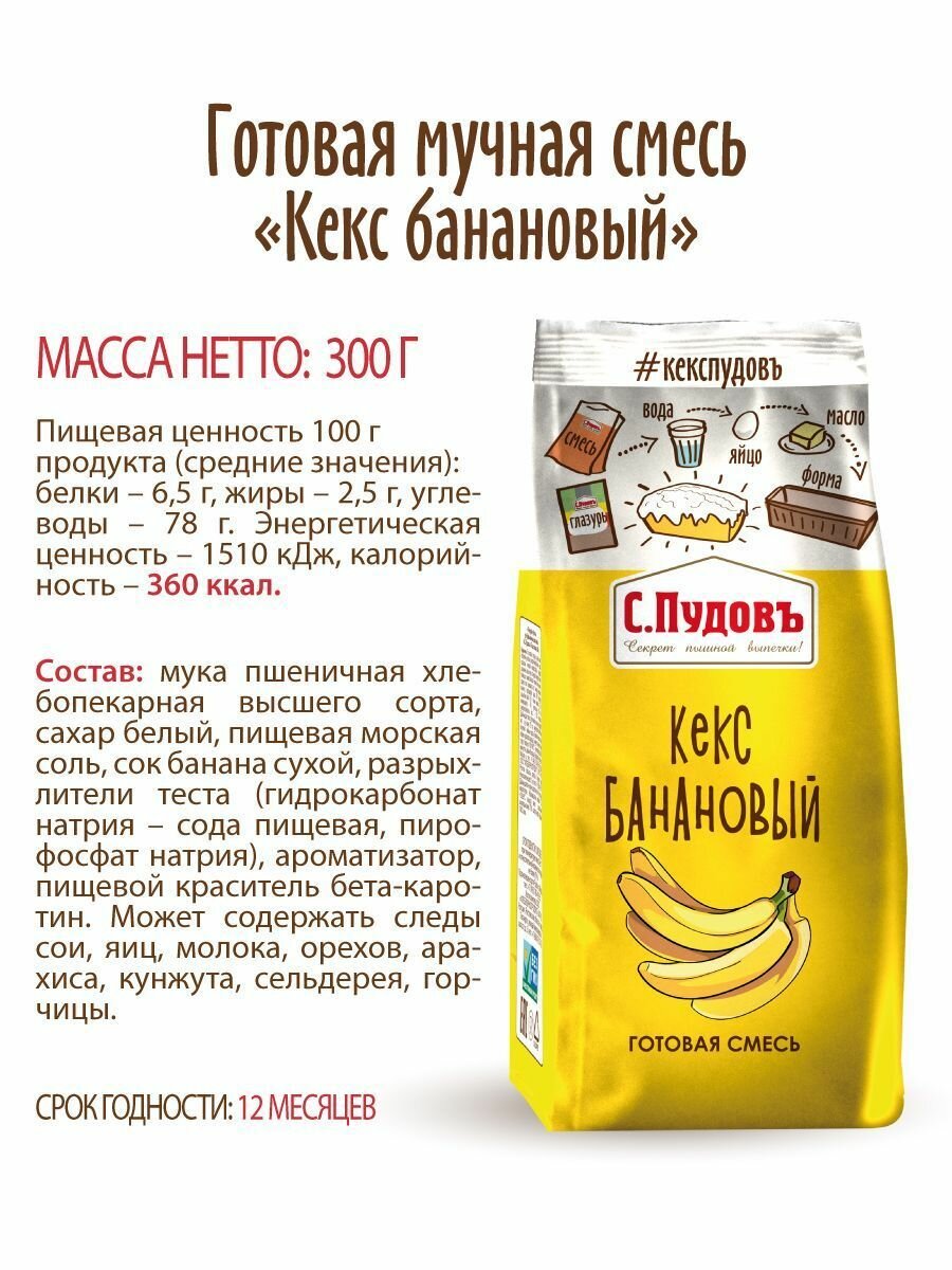 Смесь для выпечки "Кекс банановый" С.Пудовъ, 0.3 кг интересное: