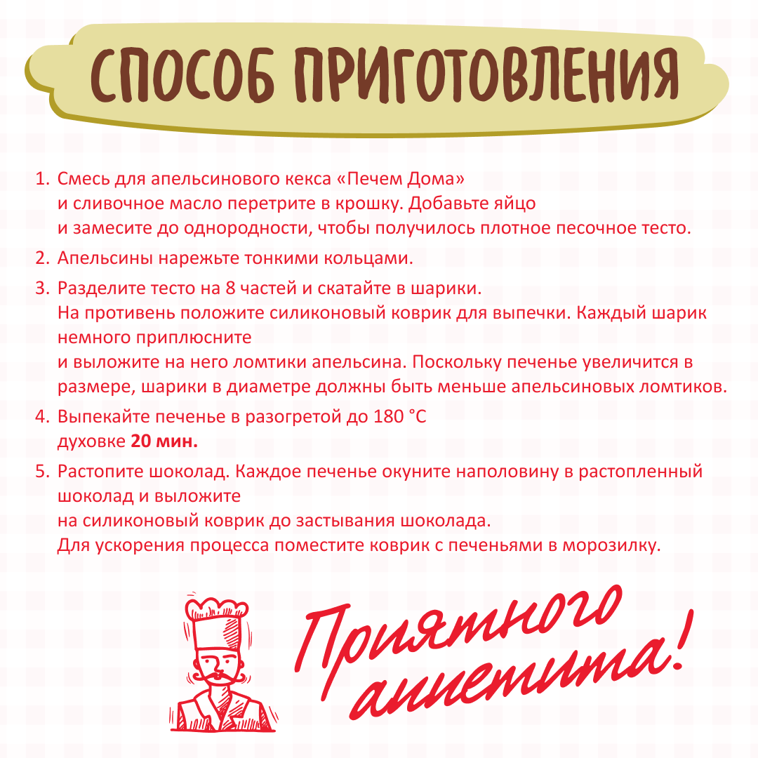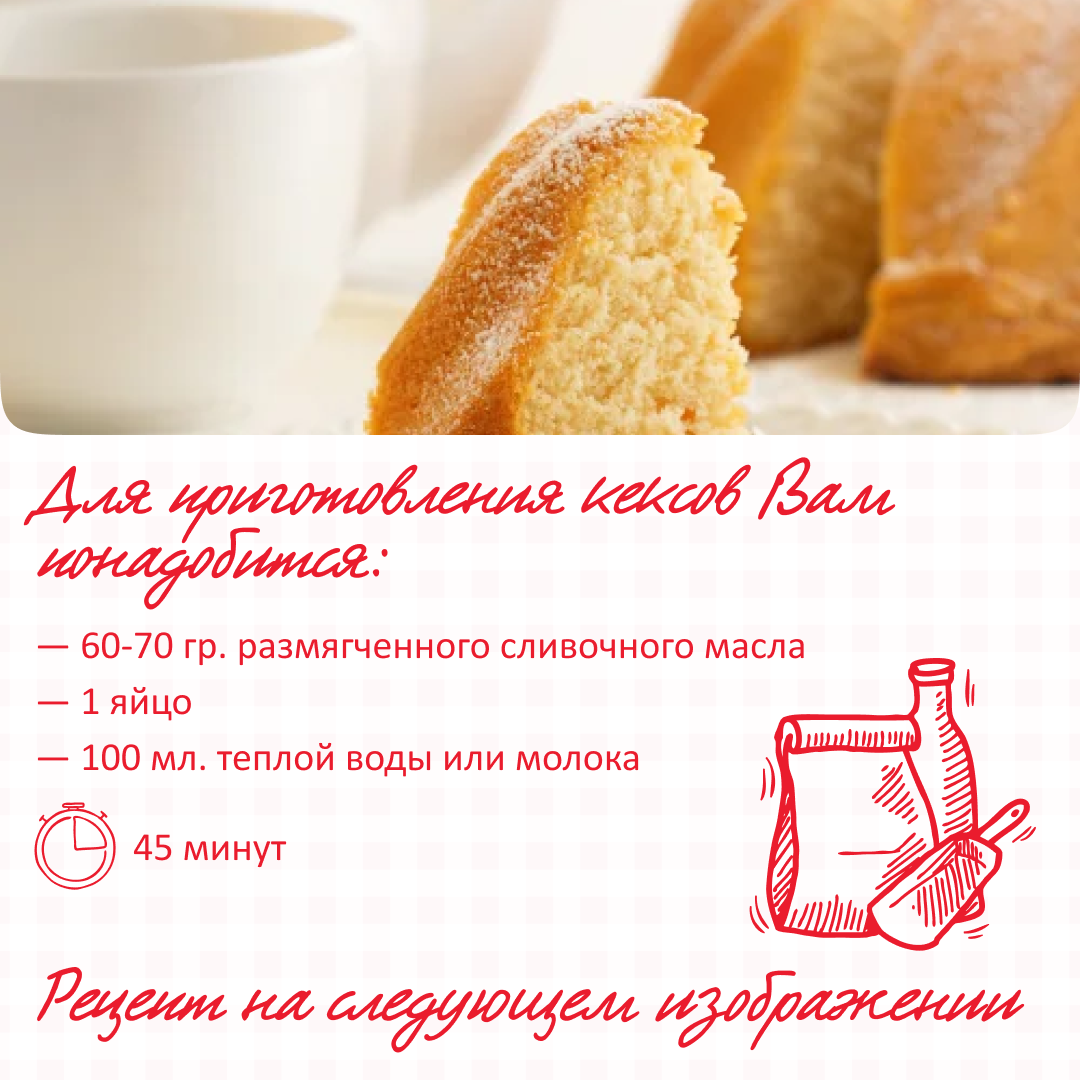 | Дополнительная информация | К содержимому пакета добавить 100 мл теплой воды или молока, 1 яйцо и 60-70 г размягченного сливочного масла (или маргарина) или подсолнечного масла. Быстро размешать до получения однородной массы. Готовое тесто выложить в смазанную сливочным маслом или маргарином форму, заполнив ее на 3/4 высоты. Выпекать в предварительно разогретой до 180-200 С духовке в течение 40-45 минут. Проверить готовность кекса деревянной палочкой. |
