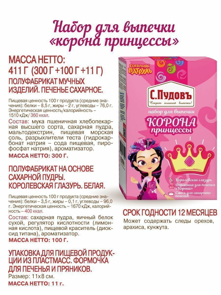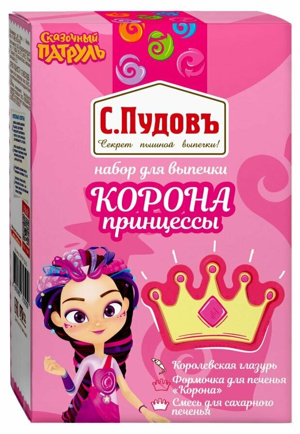 СохранитьНабор для выпечки печенья "Корона принцессы" Сказочный патруль С.Пудовъ, 0,411 кг (смесь, формочка, глазурь) интересное: