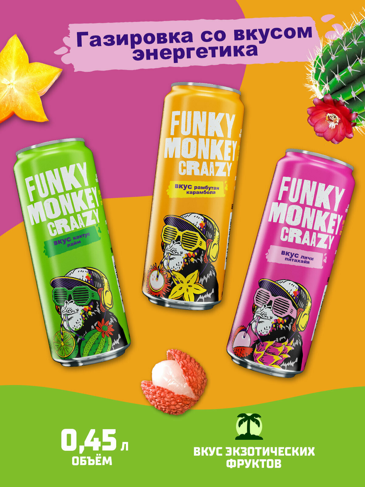 Напиток газированный Funky Monkey (Фанки Манки) Craazy Рамбутан-Карамбола 0,45 л х 12 банок