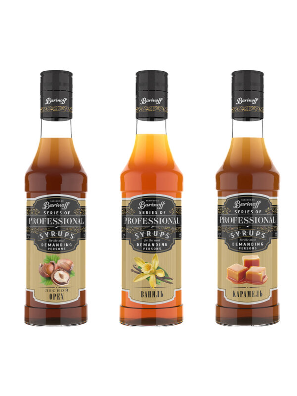 Набор сиропов Barinoff для кофе и чая Лесной Орех, Ваниль, Карамель (3 шт по 330 г /250 мл)