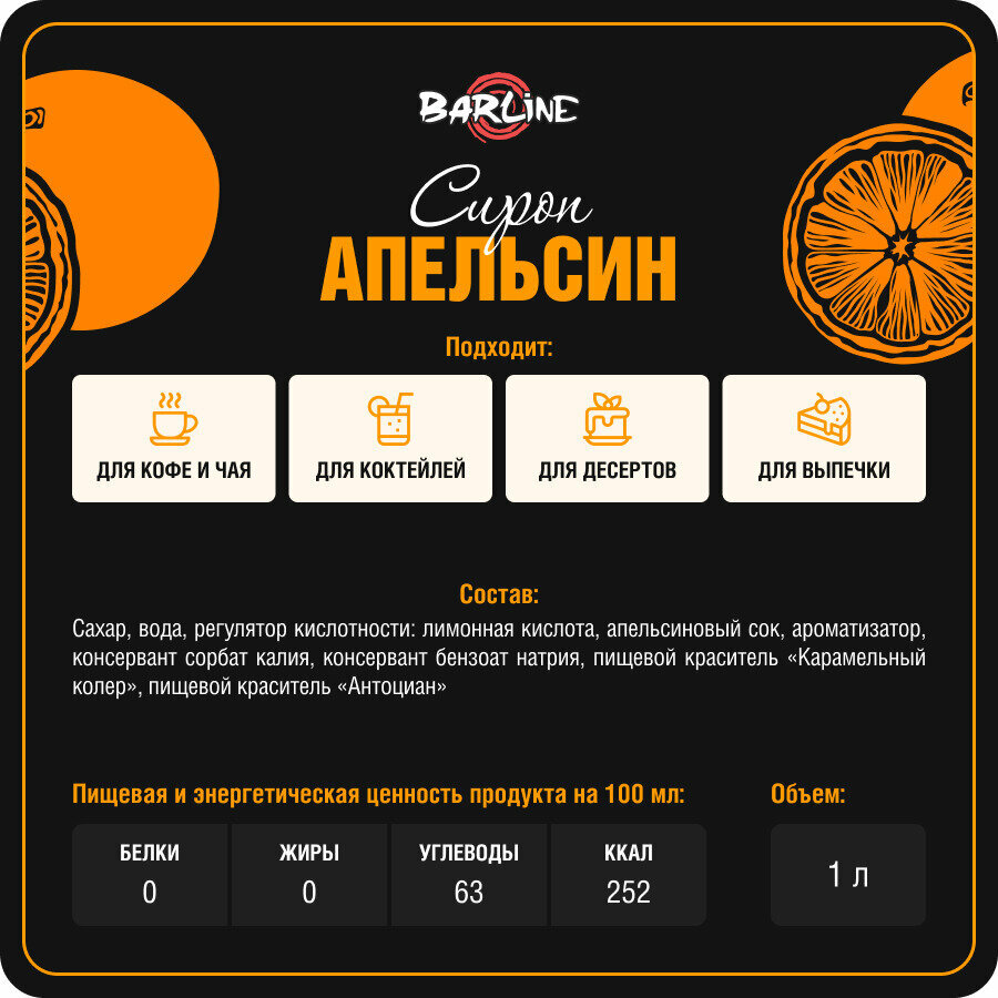 СохранитьСироп Barline Апельсин (Orange), 1 л, для кофе, чая, коктейлей и десертов, пластиковая бутылка, Барлайн интересное: