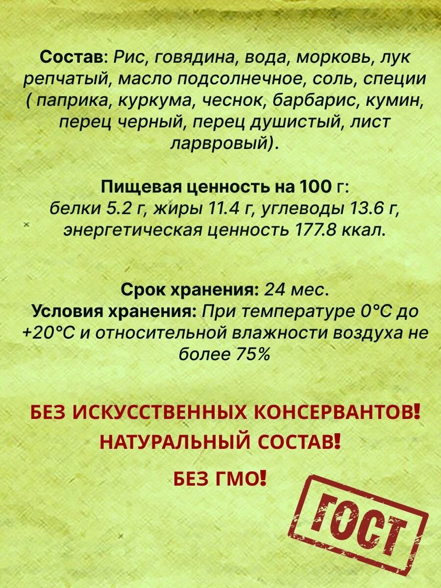 | Состав | Рис, говядина, вода питьевая, морковь, лук репчатый, масло подсолнечное, соль поваренная пищевая, специи (паприка, куркума, чеснок, барбарис, кумин, перец черный, перец душистый, лист лавровый) |