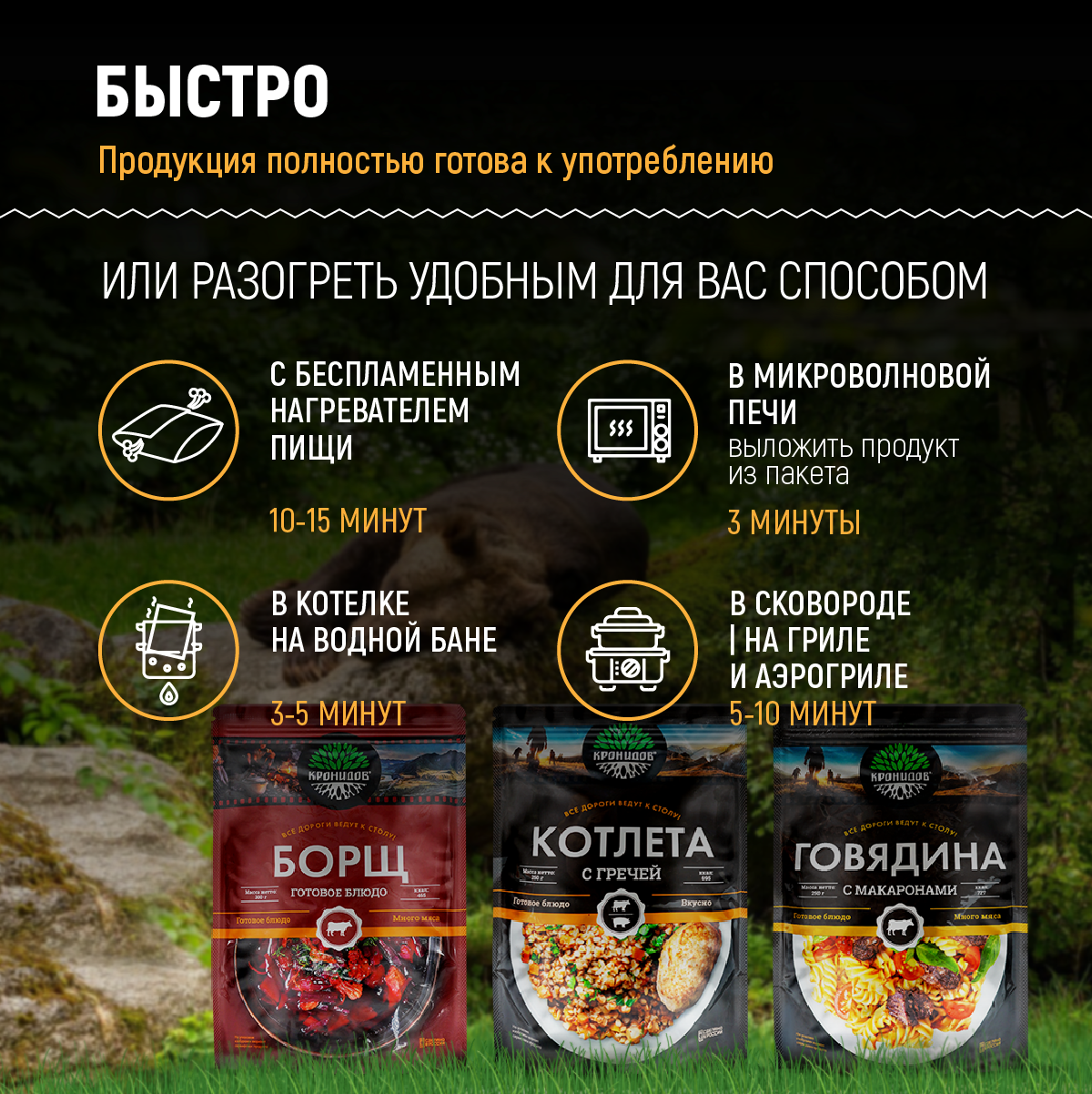 Готовое натуральное блюдо в реторт-пакете "Борщ" Кронидов Сухой паек для охоты, рыбалки, в поход Набор 3 шт. по 300 гр.