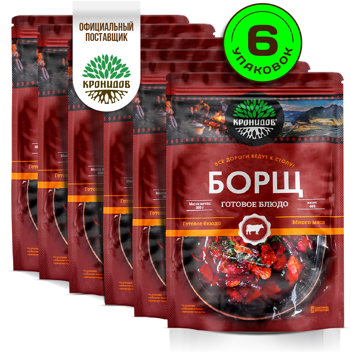 Готовое натуральное блюдо в реторт-пакете "Борщ" Кронидов Сухой паек для охоты, рыбалки, в поход Набор 6 шт. по 300 гр.
