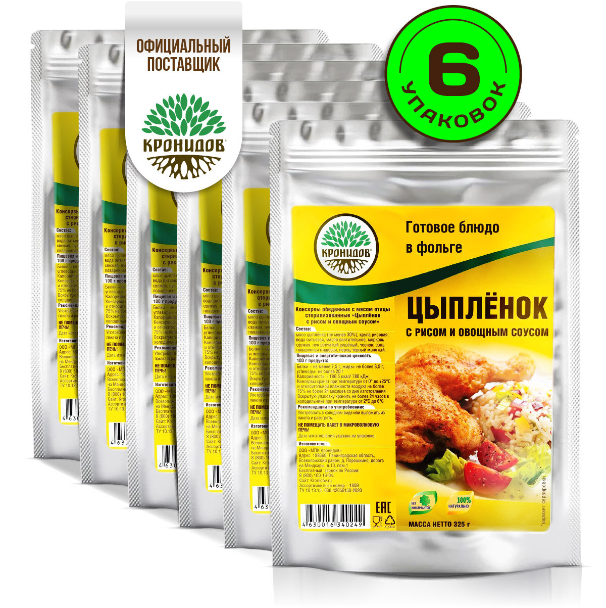 Кронидов Цыпленок с рисом и овощным соусом Готовое блюдо в фольге. Консерва натуральная Набор 6 шт. по 325 г