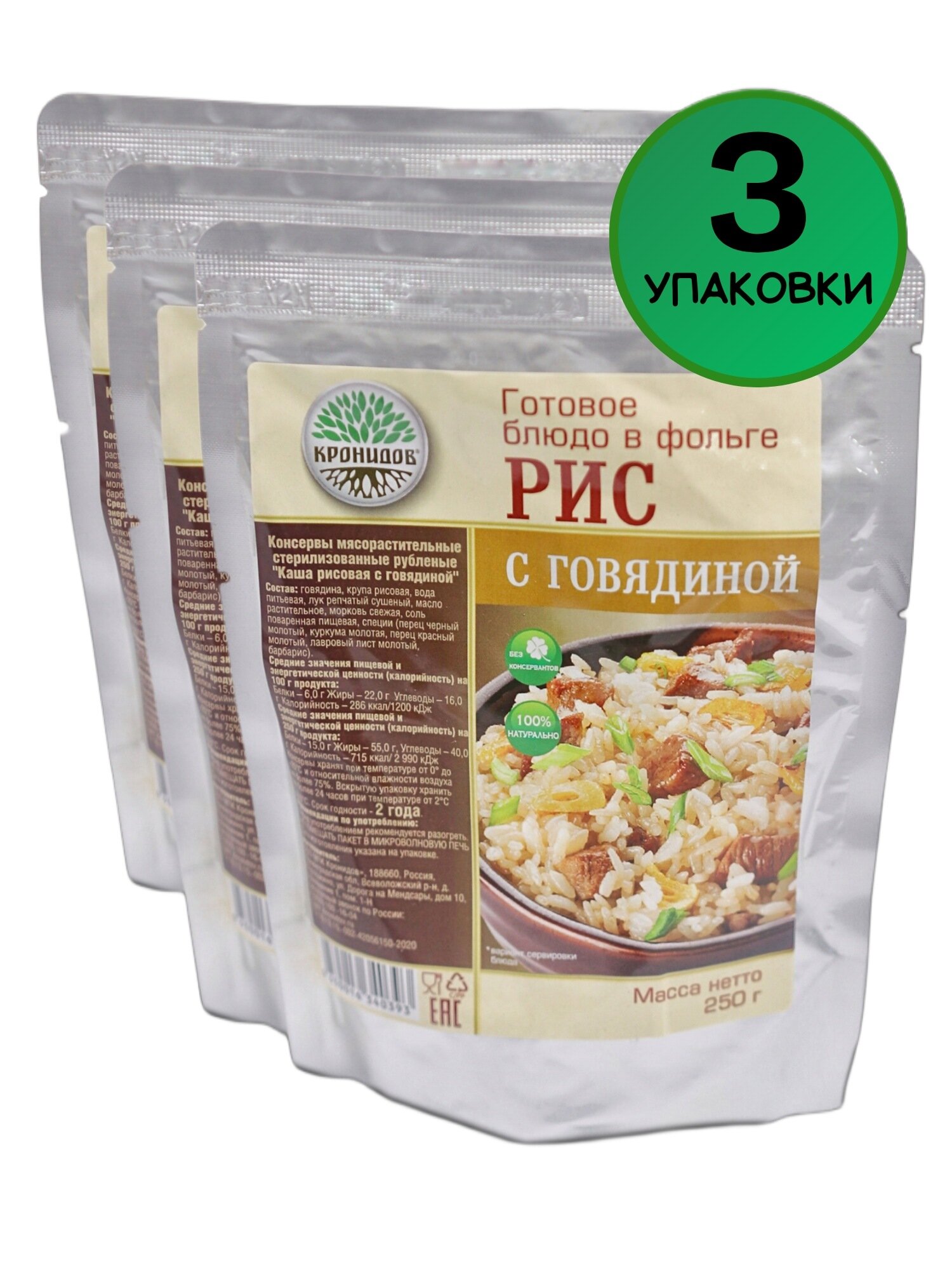 Кронидов Рис с говядиной Готовое блюдо в фольге. Консерва натуральная Набор 3 шт. по 250 г