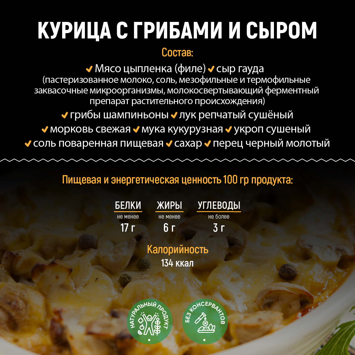 | Состав | Мясо цыпленка (филе), сыр гауда (пастеризованное молоко, соль, мезофильные и термофильные заквасочные микроорганизмы, молокосвертывающий ферментный препарат растительного происхождения), грибы шампиньоны, лук репчатый сушёный, морковь свежая, мука кукурузная, укроп сушеный, соль поваренная пищевая, сахар, перец черный молотый. |