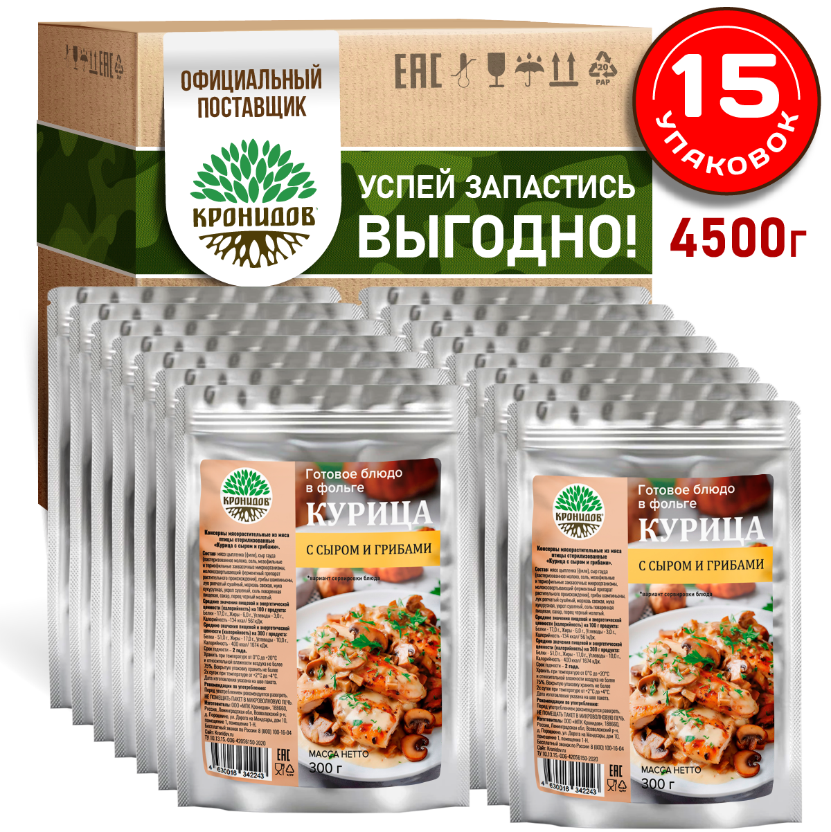 Готовое блюдо в реторт-пакете "Курица с сыром и грибами" Кронидов. Сухой паек для охоты, рыбалки, в поход. Набор 15 шт. по 300 г